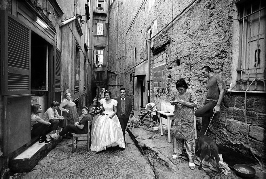 La selezione fotografica di Francesco Cito proviene dal progetto “Matrimoni Napoletani” (o “Neapolitan Wedding”), vincitore del prestigioso World Press Photo nel 1995 (categoria “Day in the Life”, 3° premio). Anche in questo caso, l’autore abbandona la monotonia della fotografia matrimoniale convenzionale per creare un linguaggio visivo nuovo, fortemente autoriale, che esplora le dinamiche sociali del matrimonio con occhio critico e riflessivo. L’approccio di Cito scompone il matrimonio tradizionale, come scritto da Michele Smargiassi nell’introduzione al libro Neapolitan Weddings, analizzando con precisione il meccanismo socio-antropologico di questo rito: “Sposarsi qui non è solo folclore ed esibizione. Non è solo un giorno speciale… Tutto il contrario, è la sospensione dell'ordinario, il trasferimento momentaneo ma radicale di un'intera comunità parentale, amicale, sociale in un'altra dimensione, senza più alcun rapporto con l'esistenza ordinaria di tutti. Cito affronta una ‘struttura’ possente, coerente, collaudata, funzionante: il moderno matrimonio foto-genico nella sua fenomenologia più completa e pura. E la de-struttura per comprenderla e smontarla con cura”.