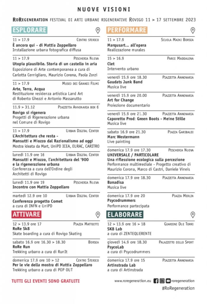 Dall’11 al 17 settembre si svolge a Rovigo "RoRegeneration”, una settimana di eventi promossi dall’Amministrazione comunale per esplorare i temi della rigenerazione urbana, tra fotografia, arte contemporanea, mostre, installazioni, street art, live painting, set musicali, trekking urbani, un documentario, incontri, laboratori.