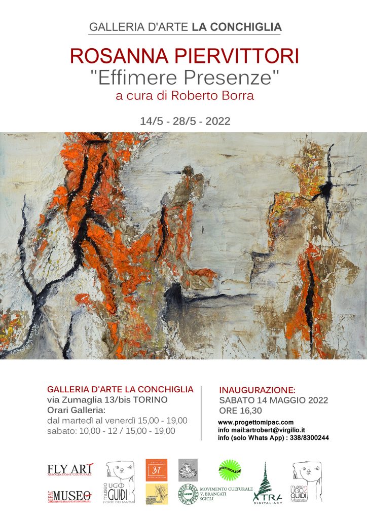 Nell’ambito dell’intensa attività espositiva 2022 l’Associazione Culturale Fly Art, propone nella storica galleria d’arte La Conchiglia di Torino, dal 14 al 28 maggio la prima mostra personale della pittrice Rosanna Piervittori dal titolo Effimere presenze a cura di Roberto Borra. L’evento è inoltre sostenuto dall’Associazione Culturale Collettivo 37 di Torino, dal Museo Ugo Guidi di Massa Carrara, dal Comitato Artistico Documentario Gierut di Pietrasanta(Lu) dal Museo Mipac di Torino, dal Mug 2 di Forte dei Marmi(Lu), dall’Associazione Arti Solide di Novara, dal Movimento Culturale Brancati di Scicli(Rg) e da Axtra Digital Art di Torino. Effimere presenze si configura come un inno alla bellezza ed alla complessità della natura in chiave astratto informale, modalità inusuale se non quasi inedita per una tematica, quella naturalistica che offre interessanti spunti di discussione e riflessione.. Rosanna Piervittori con la sua arte contemplativa ci invita alla riflessione, ci conduce a camminare con lentezza sui sentieri dei suoi paesaggi immaginari per destare l’attenzione verso le questioni essenziali…ed è all’ora che ci accorgiamo che in fondo, al cospetto della natura, siamo noi le … effimere presenze.
