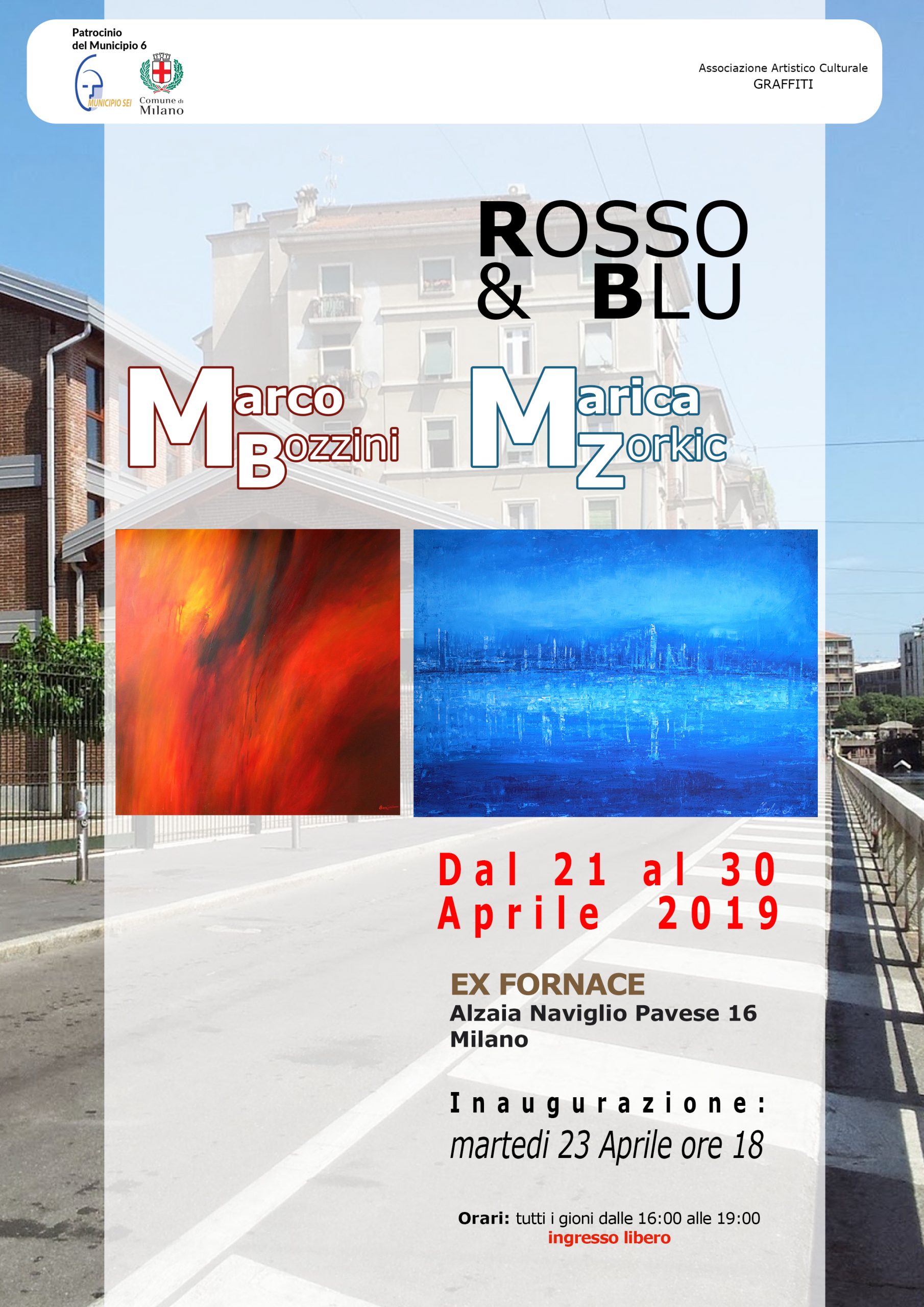 Di fronte ai colori si provano sempre delle sensazioni intense, fatalmente si rievocano immagini, emozioni, ricordi racchiusi nell’inconscio di ciascuno di noi. L’Associazione Graffiti di Lacchiarella ha raccolto al suo interno due artisti: Marco Bozzini e Marica Zorkic, che confrontandosi con gli aspetti cromatici del Rosso e del Blu, hanno dato luogo al progetto esplicitato nel titolo. Il Rosso è il colore della forza, dell’energia che scorre nelle vene, della voglia di vivere e dell’eccitazione, si lega alle atmosfere calde e ai temi della passione. Il Blu è il colore delle sensazioni fresche, guida all’ascolto interiore e alla meditazione, si collega all’ immagine del cielo e del mare e agli spazi che inducono serenità e quiete.