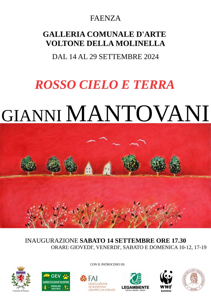 SABATO 14 settembre 2024 alle ore 17,30 presso la Galleria Comunale di Faenza (RA) il Voltone della Molinella in Piazza del Popolo, si inaugura “ROSSO Cielo e Terra”, una personale di Gianni Mantovani che rimarrà allestita fino al 29 settembre e sarà aperta al pubblico dal giovedì alla domenica nelle ore 10:00-12:00 e 17:00 -19:00.