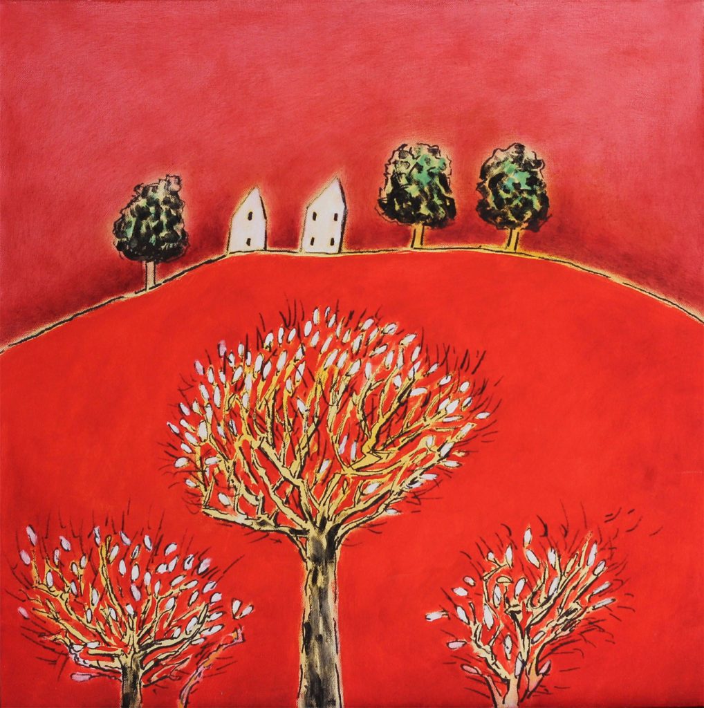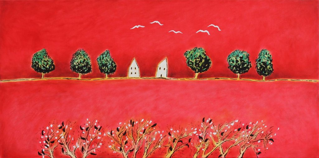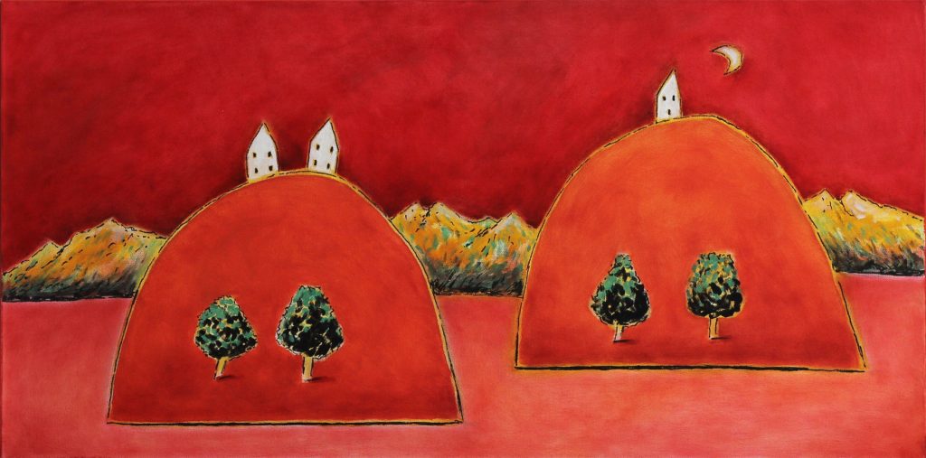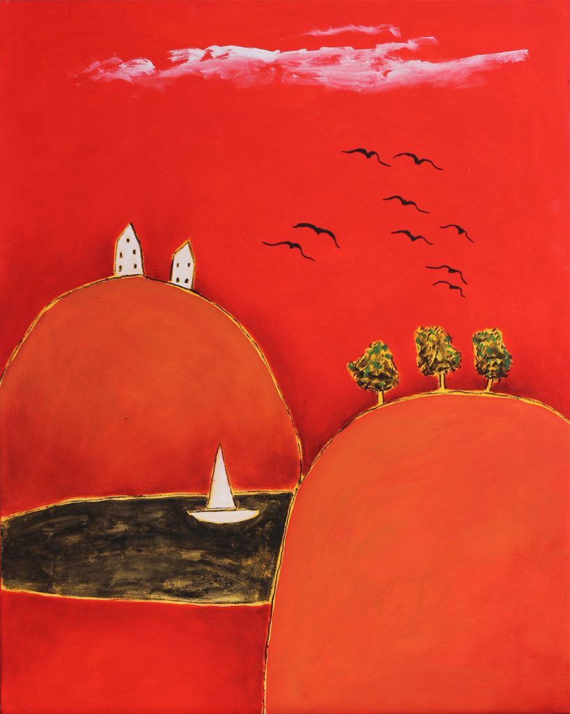 Il motivo caratterizzante delle opere in mostra è il paesaggio dal colore rosso, che testimonia la sensibilità dell’artista verso il surriscaldamento globale del pianeta ed i preoccupanti e sempre più accelerati cambiamenti climatici.