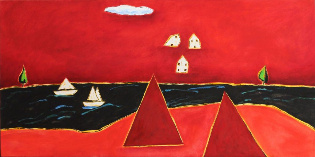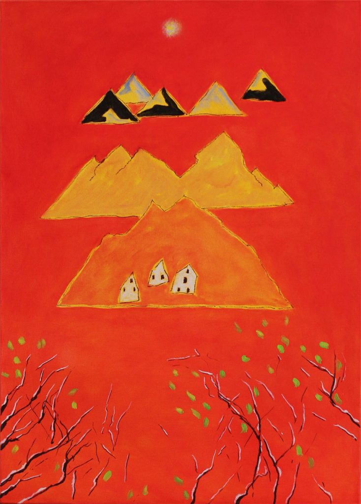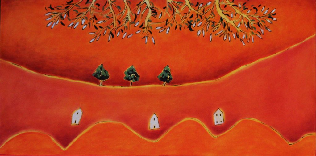 Il motivo caratterizzante delle opere in mostra è il paesaggio su sfondo rosso, che testimonia la sensibilità dell’artista verso il surriscaldamento globale del pianeta ed i preoccupanti e sempre più accelerati cambiamenti climatici.
