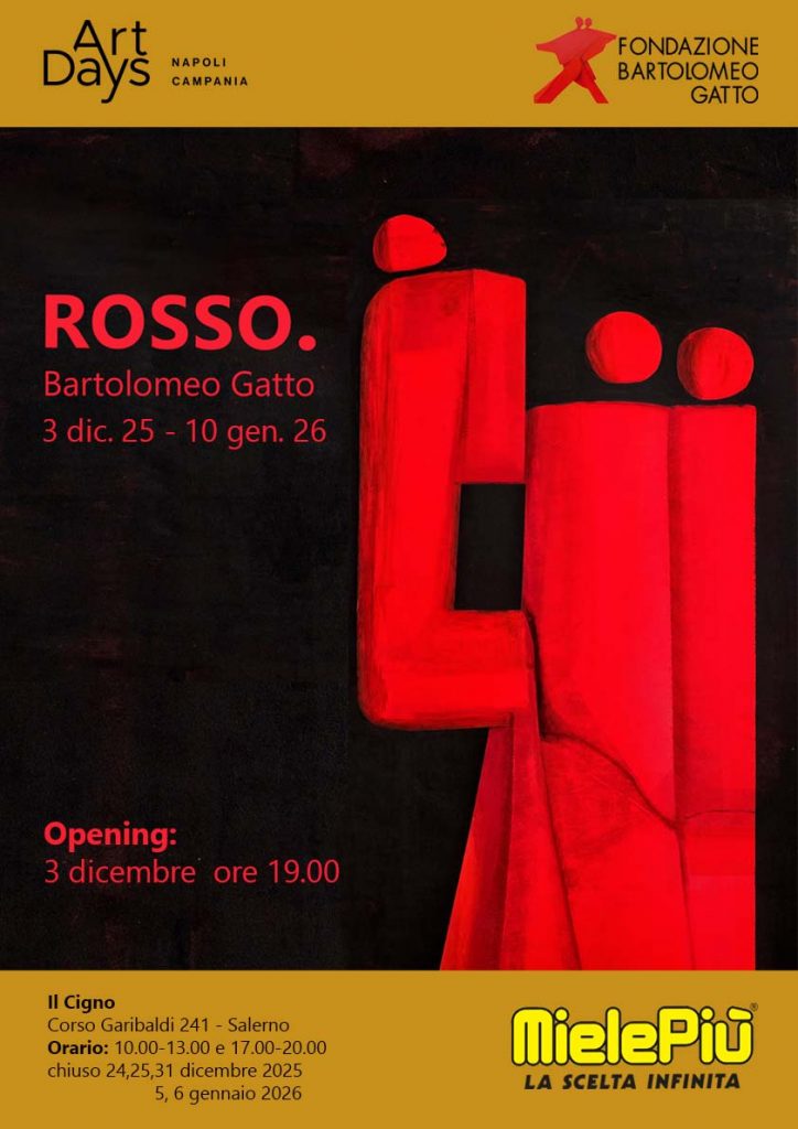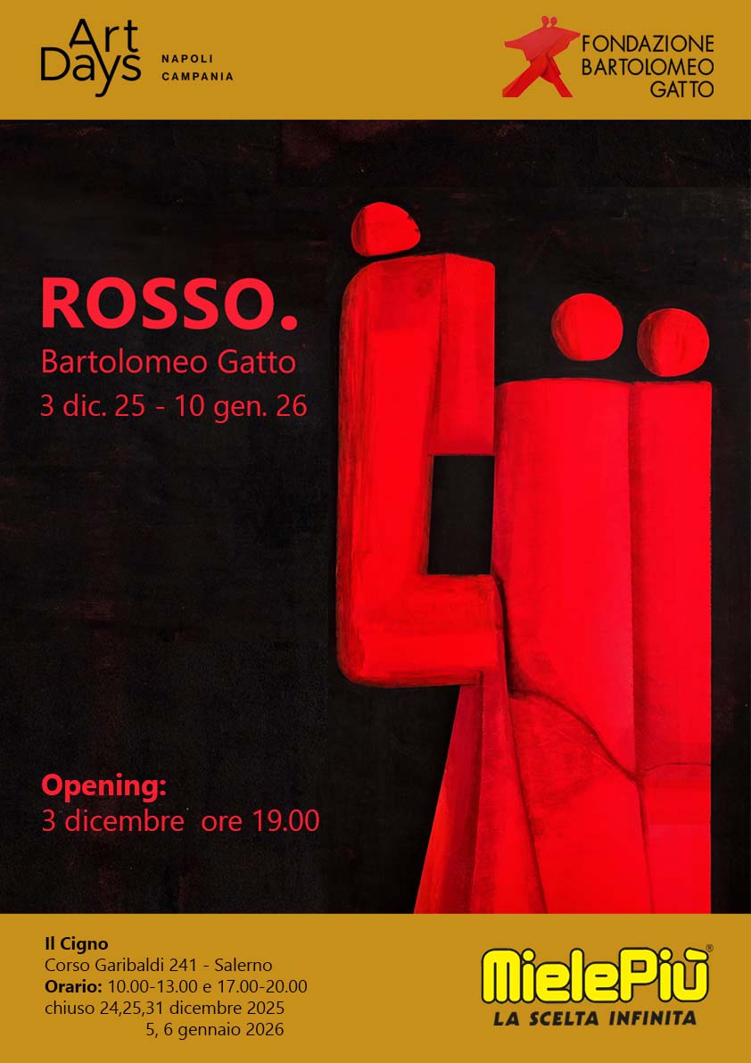 Nell’ambito della manifestazione Art Days Napoli Campania, La Fondazione Bartolomeo Gatto presenta la mostra “Rosso.” di Bartolomeo Gatto con dieci opere inedite. “Sono dipinti realizzati dal 1990 al 2010 molti dei quali presentati al pubblico per la prima volta”, afferma l’architetto Carla Gatto, curatrice della mostra. “A partire dagli anni Duemila, Bartolomeo Gatto riduce volontariamente lo spettro cromatico, concentrandosi su gamme tonali limitate e coerenti. In questa fase il “rosso” diventa la sua firma più riconoscibile: un colore totale, sintesi di vita e distruzione, di amore e conflitto. Per l’artista, Rosso è l’impronta dell’uomo: il fuoco che forgia, il sangue che scorre, la carne che vive. È la traccia della presenza umana sulla terra, un segno indelebile che attraversa epoche, miti e tragedie contemporanee. Il titolo scelto per la mostra “Rosso. (punto)” indica che proprio qui sono racchiusi tutti i significati e le sfumature di questo colore e non c’è bisogno di andare oltre.