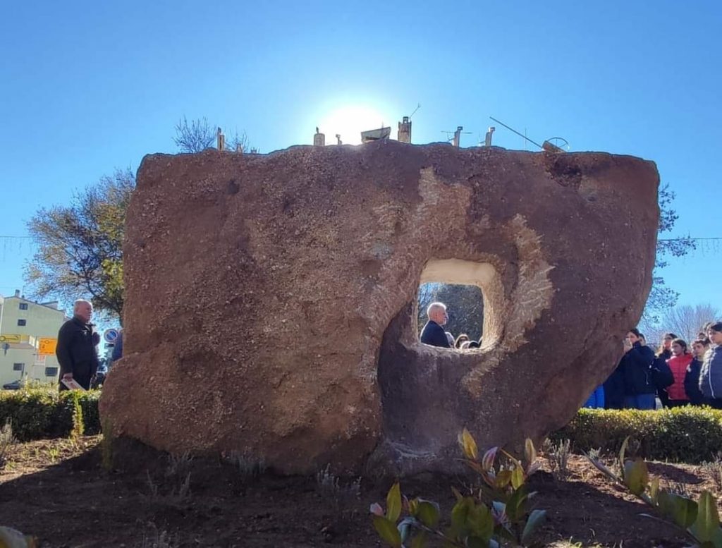 Oggi, nell’aiuola al centro dell’incrocio, vediamo una pietra. Su di essa un carretto ed alcuni personaggi vagamente somiglianti a bronzetti nuragici intenti alla trebbiatura.