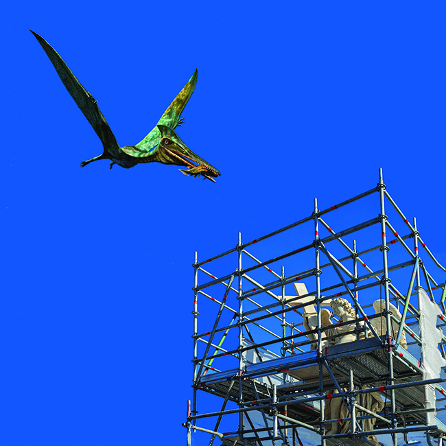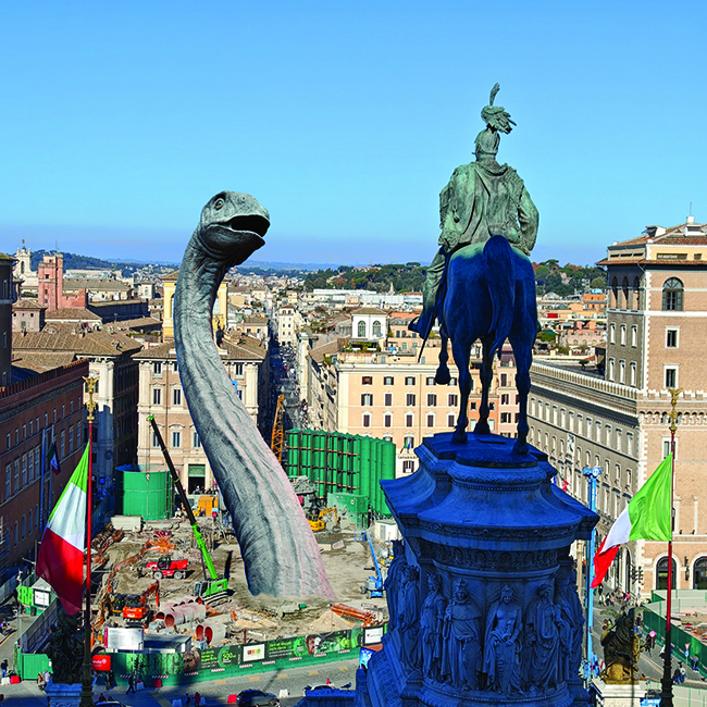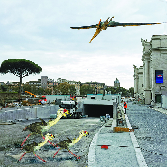 Fotografie creative di Teresa Bianchi. "... Roma è invasa dai dinosauri e la fotografa come in un reportage di guerra documenta le rovine della città eterna falciata dagli enormi mostri entrati in azione come ruspe e trivelle. Dietro il lavoro della fotografa coaudiuvato da Maristella Campolunghi ironia e denuncia si intrecciano surrealmemte.