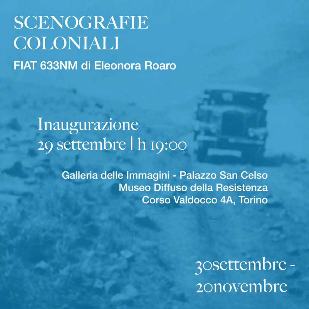 Il Museo Diffuso della Resistenza, della Deportazione, della Guerra, dei Diritti e della Libertà di Torino, all'interno del progetto integrato “il colonialismo e noi” con il contributo del Polo del ‘900 ospita negli spazi di Palazzo San Celso la mostra temporanea dal titolo “Scenografie coloniali. FIAT 633NM di Eleonora Roaro”.