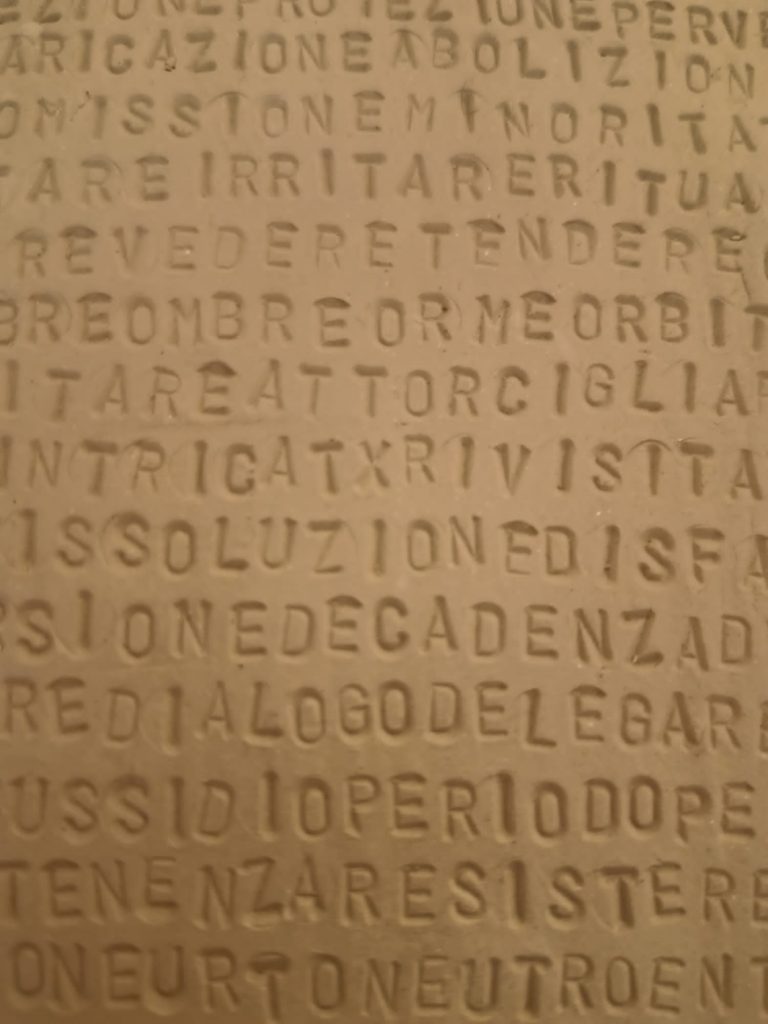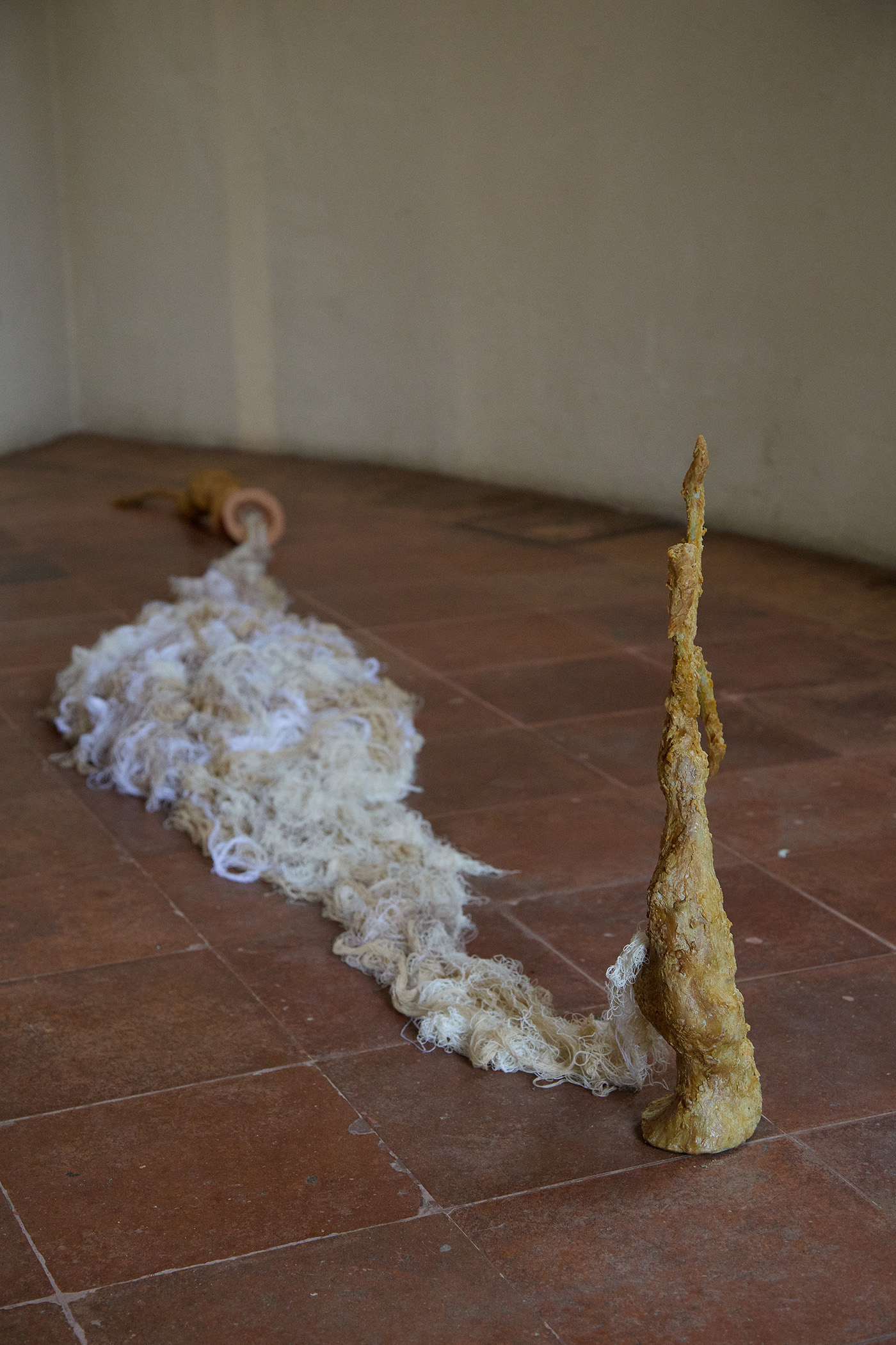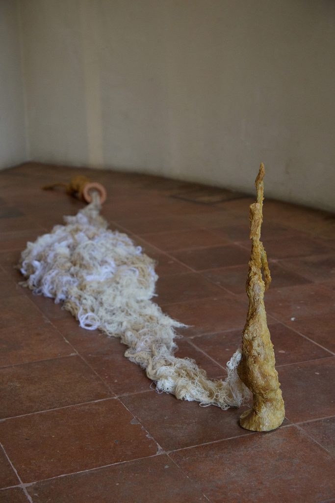 La parola, scintilla del pensiero, può essere unificatrice ma allo stesso tempo divisiva, soprattutto quando viene deformata, non capita, ma nel gioco del telefono senza fili, essa ha una funzione strumentale; depotenziata del suo significato, è finalizzata unicamente a mezzo per perpetuare il gioco, per creare la relazione tra i partecipanti. I due corpi in creta e cera adagiati sul pavimento, sono la rappresentazione simbolica di due cavità, due entità organiche comunicanti tra loro, due corni, due bocche, forgiate con materiali similari alla texture della pelle. “Le due cornette” rispondono alle non regole impressa sul dittico di tavolette d’argilla cruda, poste all’interno delle due nicchie. Sulla prima tavoletta sono state impresse più di cinquanta parole che si susseguono mediante connessioni fonetiche o di senso. La seconda tavola presenta al suo centro una virgola, segno di punteggiatura che per l’artista assume il significato rappresentativo della figura femminile nella storia passata e presente.
