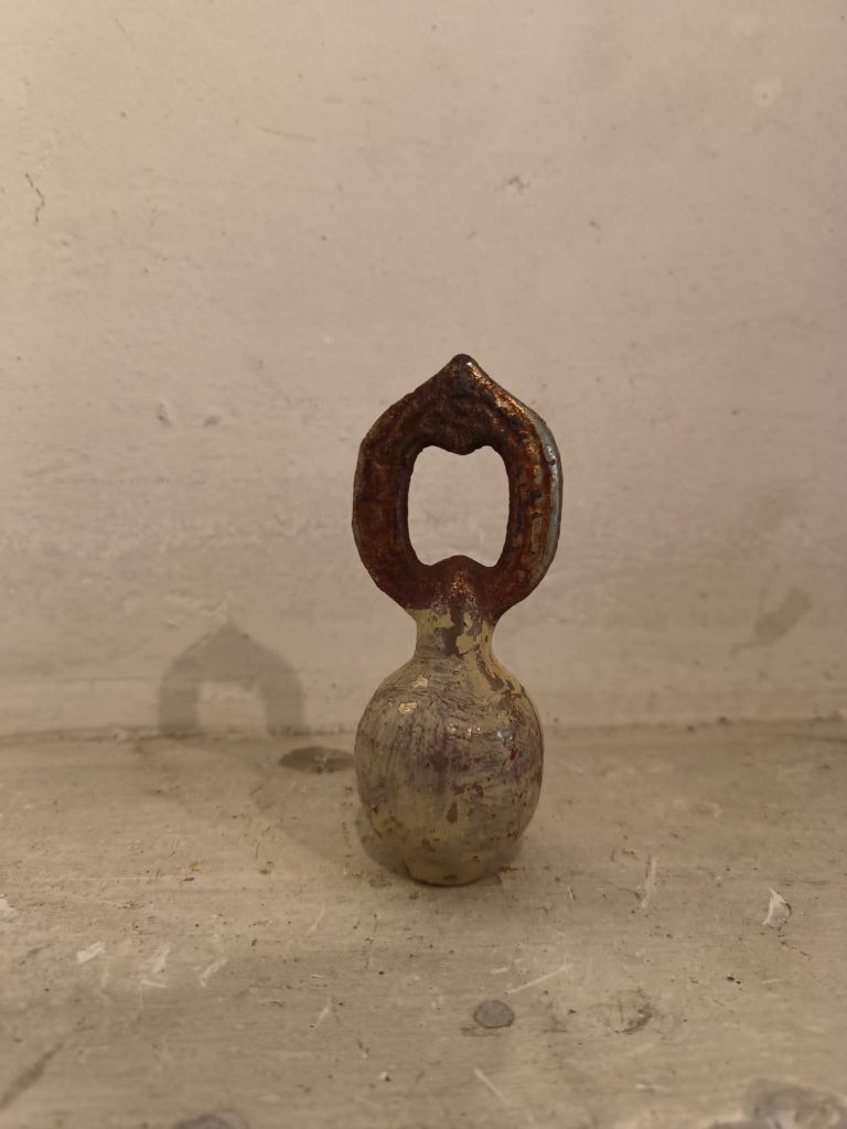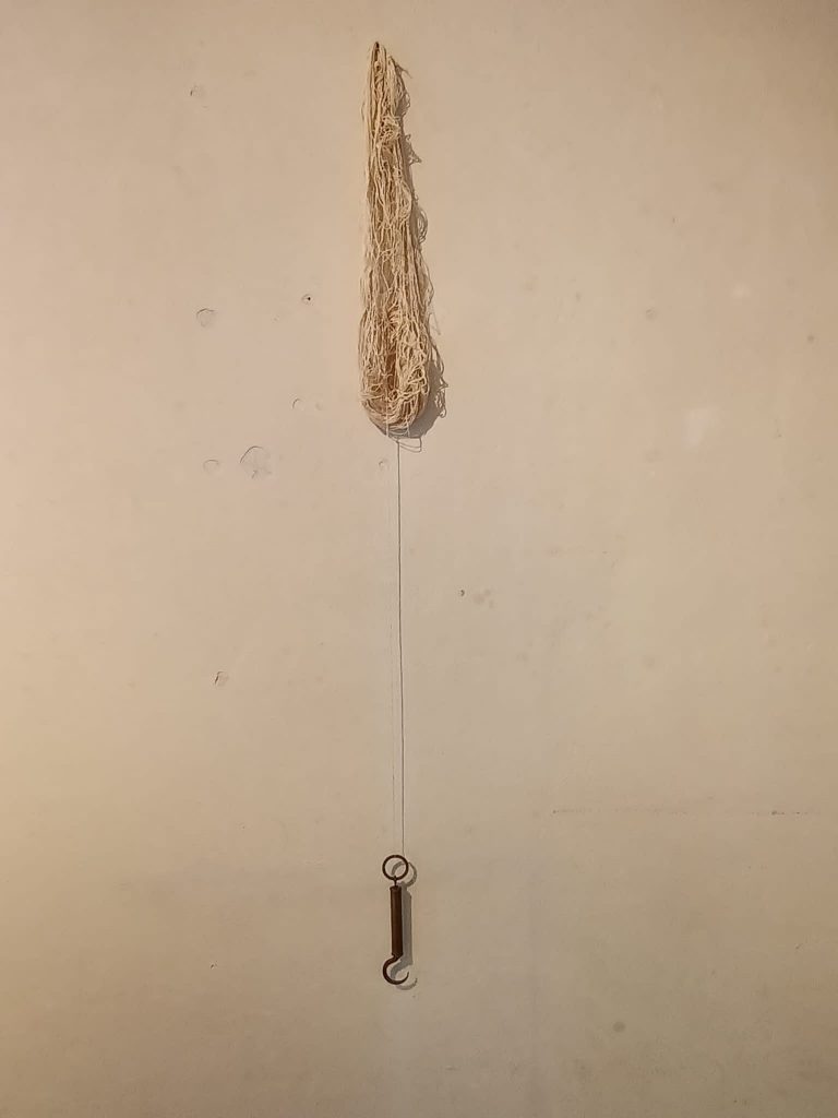 La virgola, diversamente dal punto, implica un proseguire. Oltre a ciò, è un elemento chiave del discorso poiché guida il senso nelle frasi. Il piccolo gruppo scultoreo è attraversato da un filo che trapassa ogni elemento, rappresentando il legame invisibile che unisce le donne* in un tessuto di solidarietà. Elio con la sua installazione, si serve di un linguaggio ludico e sensibile, creando una grammatica immaginaria, dove i simboli e le parole, sono in primis ganci finalizzati alla creazione di un legame con l’altro, e poi, termini portatori di significato.