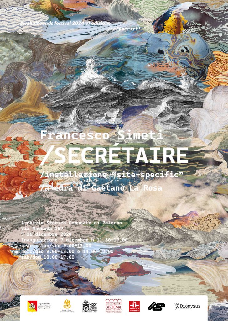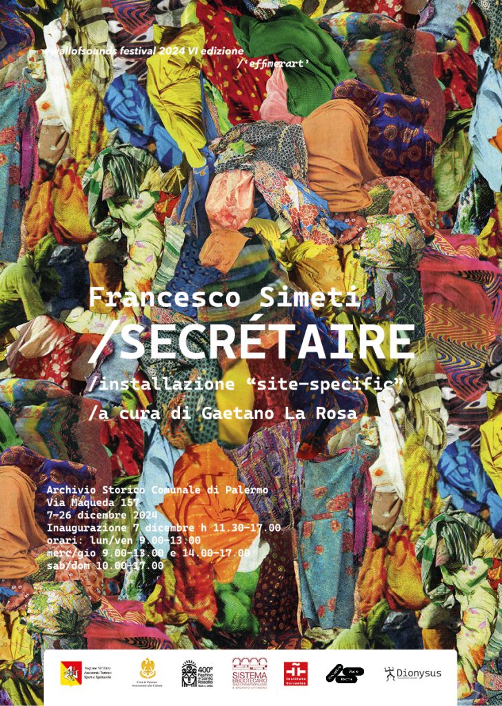 La mostra è parte di #wallofsounds 2024 festival VI edizione /“effimerart”, realizzata dall’Associazione Dionysus col patrocinio dell’Assessorato del Turismo e dello Spettacolo della Regione Siciliana, il supporto dell’Area della Cultura - Palazzo Ziino - Palermo, del Comune di Palermo, e in collaborazione con il Sistema Bibliotecario Spazio Etnoantropologico e Archivio Cittadino, della fondazione studio rizoma_, e dell’Instituto Cervantes di Palermo, e fa parte delle manifestazioni indette in occasione del 400° del Festino di Santa Rosalia.