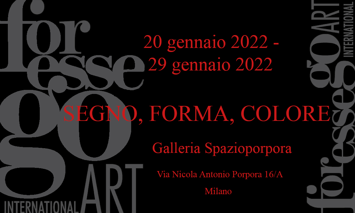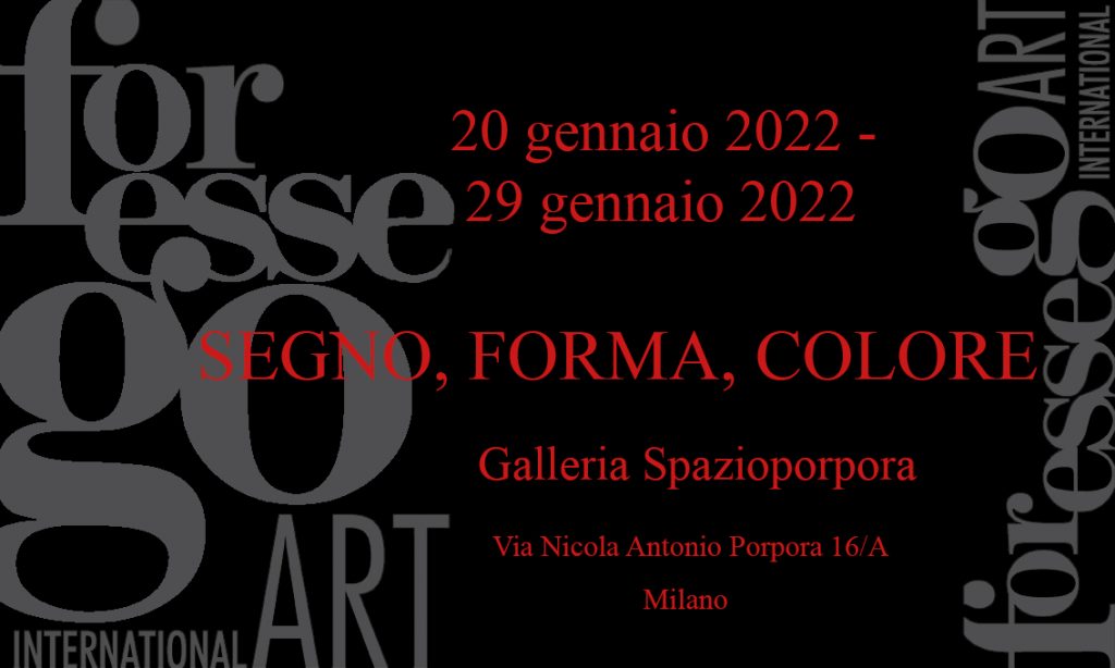 Presso la Galleria Spazioporpora di Milano, via Nicola Antonio Porpora 16/A , sarà inaugurata la mostra collettiva "Segno, forma, colore". Il vernissage sarà giovedì 20 gennaio 2022 dalle ore 18.00 alle ore 20.00, con presentazione a cura della storica d’arte Francesca Callipari, esporranno una ventina di artisti e sarà visitabile fino al 29 gennaio con orario lunedì/venerdì dalle 15.30 alle 18.30; sabato 22 dalle 15.00 alle 18.00; sabato 29 su appuntamento dalle 10.00 alle 12.00. Domenica chiuso