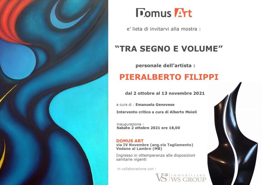 La mostra “TRA SEGNO E VOLUME” che Domus Art, lo spazio immobiliare ed espositivo con sede a Vedano al Lambro, propone dal 2 ottobre al 13 novembre 2021, è una rassegna di dipinti e sculture dell’artista monzese Pieralberto Filippi, realizzati tra il 1994 al 2021. L’esposizione si propone di documentare l’intero percorso artistico di Filippi attraverso un ‘attenta selezione di opere pittoriche e plastiche, a partire dai celebri Monocromi blu, dipinti tra il 1994 e il 2005 , in cui è “fondamentale il ruolo del colore, con la dominanza iniziale di toni blu e bianchi e il graduale inserimento, entro campiture ben definite, di toni squillanti e antinaturalistici: rosso, verde, giallo e arancione “. Si prosegue con le tele delle serie dei Simboli e dei Progetti , appartenenti al periodo dal 2006 al 2013, che rappresentano la sintesi dei simboli più ricorrenti nei suoi dipinti, fino ad arrivare ai Teatrini che, insieme alle sculture in acciaio corten, sono l’espressione artistica più attuale del Maestro monzese. La mostra comprende inoltre una selezione altrettanto significativa delle sculture dell’artista, a testimonianza dell’evoluzione del suo linguaggio plastico: dalle forme morbide e sensuali dei bronzi, alle opere in marmo come Black frames o Butterfly, in cui “ la complementarietà dei due pieni regala il senso della dialogica fondativa che dall’unità passa al doppio di sé per poi ricomporsi idealmente in un unico corpo funzionale” , giungendo infine alle più recenti sculture di piccole dimensioni in lamiera colorata , testimonianze sublimi della poesia della forma che ha da sempre contraddistinto l’arte di Pieralberto Filippi.