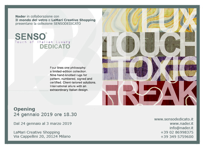 Il concept store in via Alfredo Cappellini 20, Milano ospita “Senso Dedicato Collection: Touch of Italian Luxury”, una mostra di tappeti contemporanei, presentata e ideata da Nader, importante galleria di arte tessile, considerata una dei massimi esperti di tappeti antichi e da collezione.
