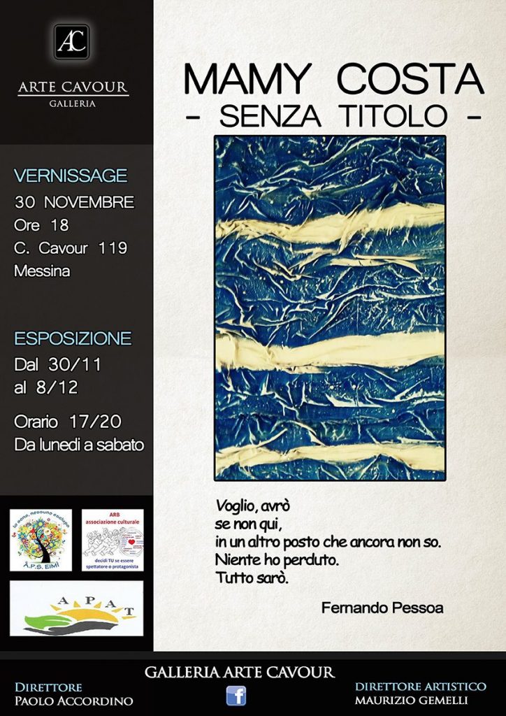 La pittrice messinese Mamy Costa esporrà strutture informali, tele variopinte e manichini modulari. Le opere in mostra sono composte da increspature ed ondulazioni che prendono forma scomponendo l’immagine. Nel suo catalogo di presentazione sono diversi i critici che descrivono le sue opere. «Quello che colpisce maggiormente nelle opere dell’artista – scrive Duro – è come la staticità di una tela possa dare questo senso di continuo divenire. Suoi lavori anche le pittosculture, come la “Testa Velata” realizzata con materiale di scarto ricoperto con tela trattata e dipinta. Nelle tele spicca la tecnica del Creating (tecnica mista materica).