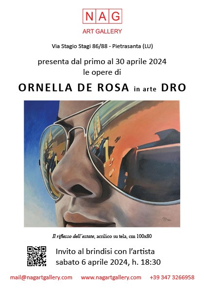 Allestita fino al 30 aprile 2024 a Pietrasanta, la mostra pittorica personale della poliedrica artista Ornella De Rosa (alias DRO) ne conferma il successo conquistato con grande energia creativa di ispirazione. La location ospitante è NAG Art Gallery, nel cuore del rinomato paese toscano, che da sempre vede in primo piano la promozione artistico-culturale a tutto tondo, ospitando eventi e iniziative ad alto livello, com'è la mostra di DRO. Per questa importante occasione espositiva è stato scelto un circuito di opere mirato, per fungere da simbolica carrellata rappresentativa di una produzione davvero variegata, frutto dello spirito camaleontico e trasformista di una donna-artista, che ha fatto dell'arte la sua più alta modalità di espressione comunicativa e che ha trovato nel fare arte un proprio caratterizzante modus per manifestare al meglio una cifra stilistica sempre sorprendente, che non si basa su cliché statici e monotoni e tanto meno su strutture e palinsesti emulativi, ma vuole imporre una propria orma, una traccia indelebile e duratura, che ne dimostra la potenza assodata e radicata. A riguardo si è pronunciata la dottoressa Elena Gollini, che ha tenuto a rimarcare alcuni concetti di fondamento nella poetica visionaria di matrice figurativa, che la contraddistingue e la rende qualitativamente subito riconoscibile e inconfondibile nelle componenti basiche primarie. In particolare la dottoressa Gollini ha commentato: “I miei complimenti per questo nuovo meritato successo espositivo rivolgo in primis alla cara amica artista DRO, che ha una innata finezza di pensiero visivo e percettivo, dominando in maniera egregia la tecnica del disegno figurale ed evidenziando il tema designato tramite dettagli e particolari di ineccepibile proiezione. DRO approfondisce ogni senso e dimensione e spazio-temporale e prospettica, utilizzando il colore e l'elemento cromatico-tonale con impeccabile equilibrio e misura, controllando il gesto pittorico, incidendo e cesellando le emozioni, mettendo a fuoco il pathos di trasporto senza mai fare prevalere l'istinto irrazionale, per avere una resa narrativa garantita. Fa uso del riferimento alla realtà e alla scena realistica per raccontare storie, integrando anche fantasia e immaginazione per rafforzare la presa di impatto verso il fruitore-spettatore in modo ancora più incisivo e sferzante. Le idee sceniche e scenografiche e i soggetti scelti a puntino fanno parte di una ricerca puntuale e compiuta e vengono corredati da tratti e aspetti di contorno per consentire una descrizione diretta e di immediata percezione visiva. Le immagini contengono anche una loro allure volutamente allusiva sottesa e insita nell'insieme dell'orchestrazione, che le rende al contempo intriganti, accattivanti, affascinanti e glamour, chic e di classe in un mix esplosivo tra figurazione e colore. Questa ricerca appartiene alla sua personale sfera realistica, che è anche multitasking e multidisciplinare, padroneggiando tecniche e discipline con indiscussa maestria e perizia”.