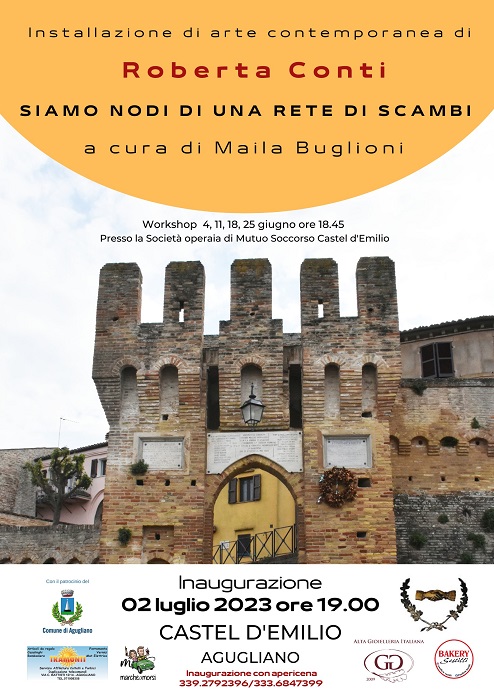 La Società operaia di Mutuo Soccorso di Castel d’Emilio (Comune di Agugliano) è lieto di invitarvi domenica 2 luglio 2023 alle ore 19,00 all’inaugurazione dell’installazione di arte contemporanea “Siamo Nodi di una Rete di Scambi” di Roberta Conti, a cura di Maila Buglioni. Il progetto nasce come momento d’integrazione con la società presente sul territorio provinciale anconetano grazie all’elaborazione di un approccio conoscitivo basato sulla pratica del workshop la cui finalità è riscoprire quella manualità e quelle tradizioni che tendono a scomparire per via del progresso tecnologico. Il risultato è la realizzazione dell’opera installativo-ambientale concepita dall’artista: quattro incontri in cui i “cesti/nodi” iniziati dall’artista sono stati definitivamente completati dalle mani dalla collettività coinvolta in situ ed appesi tra le vie del borgo.
