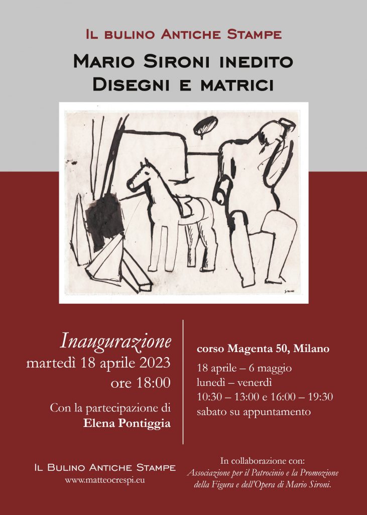 L’esposizione sarà visitabile dal 18 aprile al 06 maggio presso la Galleria Il Bulino Antiche Stampe di Matteo Crespi, a Milano in corso Magenta 50. Avremmo piacere ad invitarla all’inaugurazione, che si terrà martedì 18 aprile alle 18:00, con la partecipazione di Elena Pontiggia, punto di riferimento per gli studi su Sironi e autrice del saggio introduttivo al catalogo.