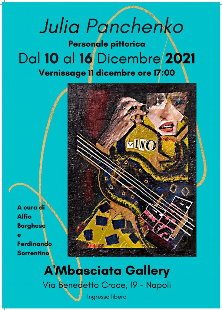 si terrà a Napoli, dal 10 al 16 dicembre, la personale pittorica di Julia Panchenko. L'appuntamento è alla A' Mbasciata Gallery, in via Benedetto Croce 19, ove avrà luogo il vernissage con l'artista l'11 dicembre alle ore 17.00. L'evento, con ingresso libero, è organizzato da Ferdinando Sorrentino con intervento critico del critico d'arte Alfio Borghese.