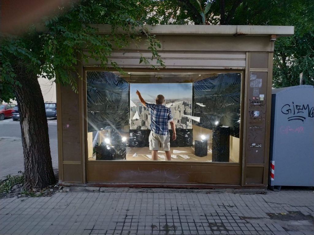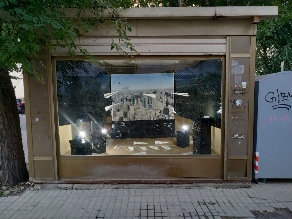 L’interno dell’ex Chiosco Mondadori è stato rivestito per l’occasione con carta d’imballaggio, al centro della vetrina New York, con degli aerei di carta che volteggiano su di lei, immagine evocativa, rimanda all’undici Settembre 2001 e al crollo delle twin tower’s, gli arei di carta vanno oltre il ludico gioco di un bambino e metaforicamente si accostano alla fragilità di vite sequestrate in volo, alcuni arei sono a terra, non sappiamo se pronti a spiccare il volo o fermi in stato d’allerta, in attesa del da farsi.