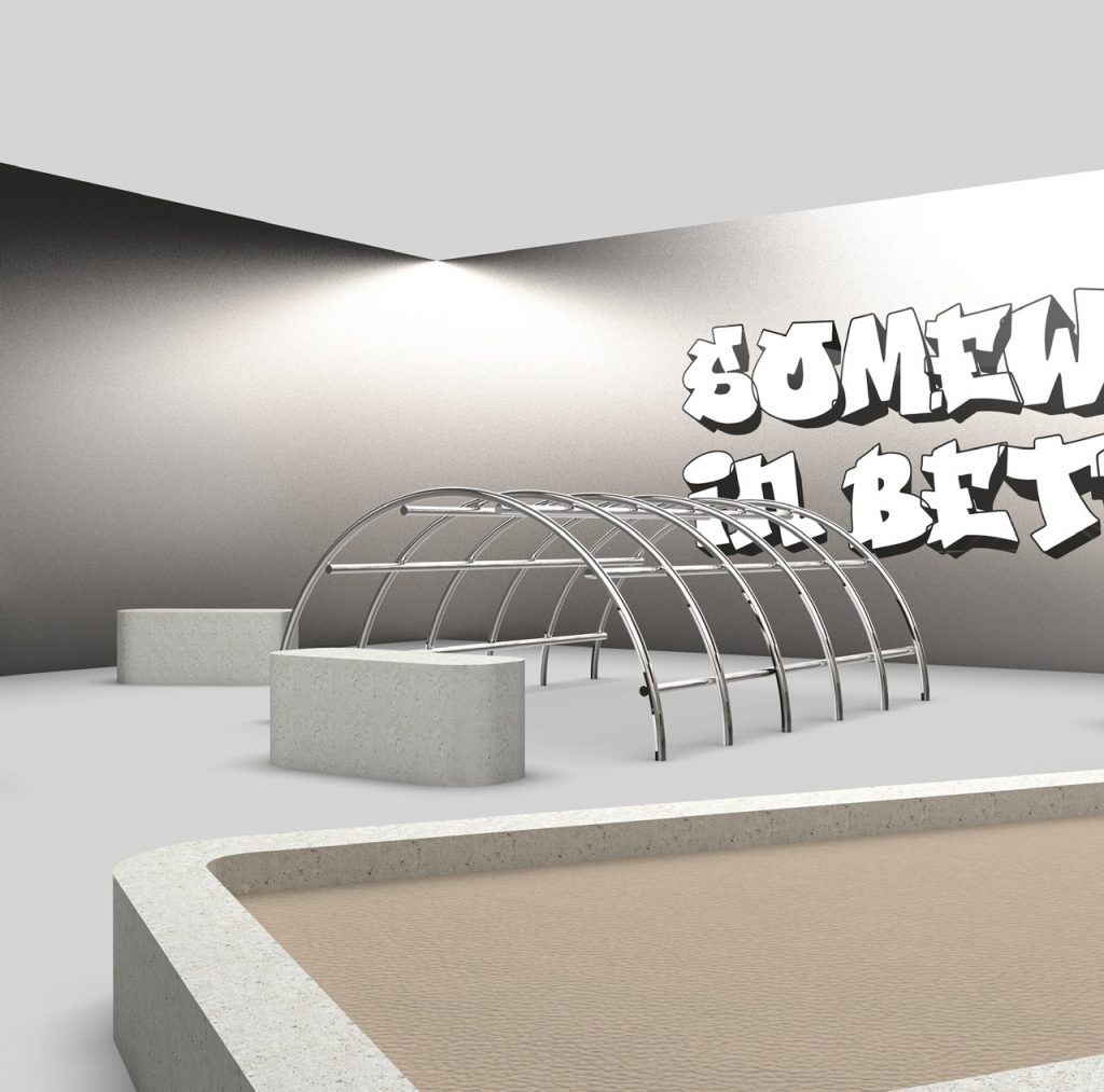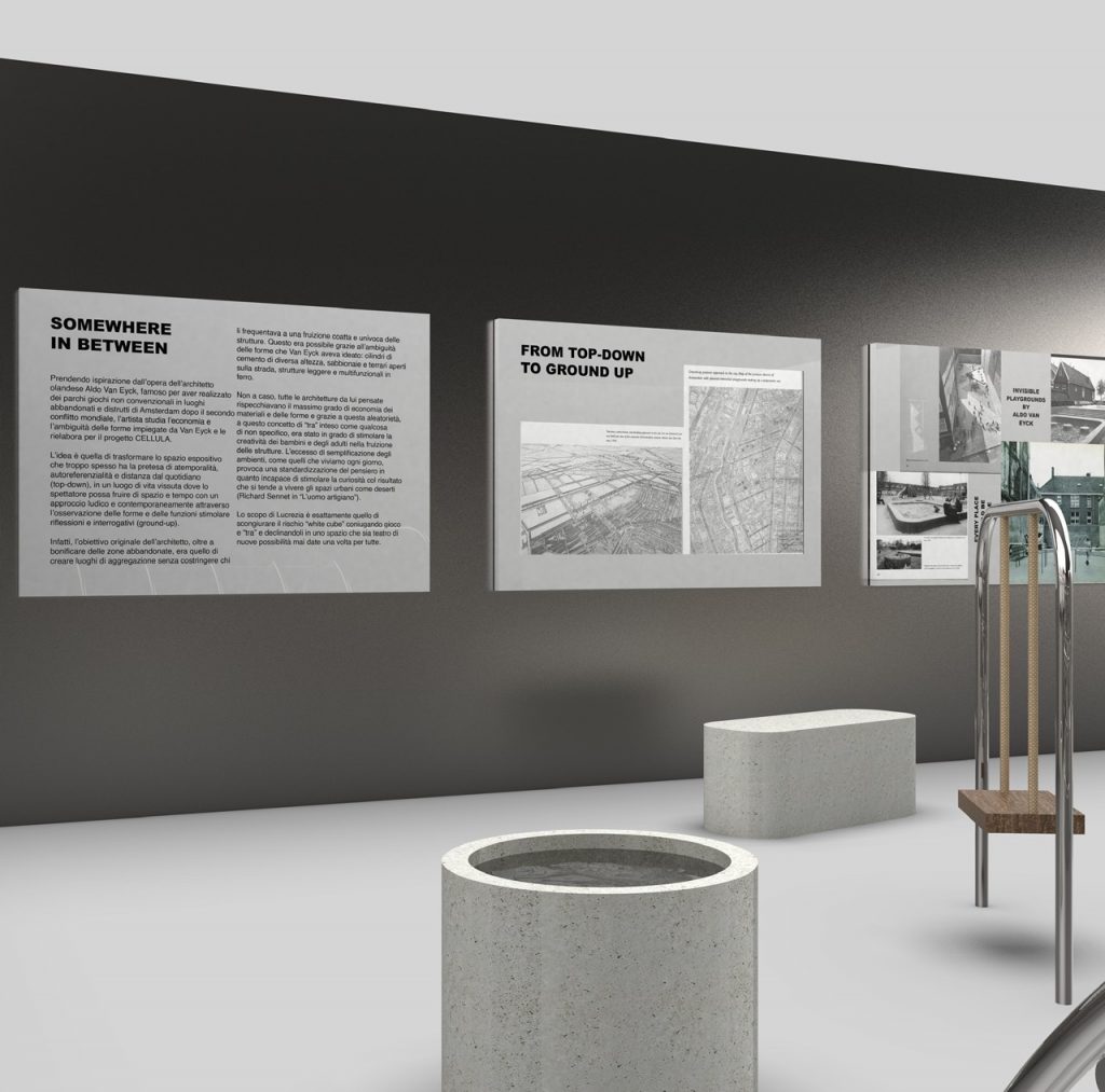 Partendo dalle riflessioni sul tema della call “Tra”, Lucrezia Costa per Somewhere in between prende ispirazione dall’opera dell’architetto olandese Aldo Van Eyck, famoso per aver realizzato parchi giochi non convenzionali in luoghi abbandonati e distrutti di Amsterdam dopo il secondo conflitto mondiale. L’artista studia l’economia e l’ambiguità delle forme impiegate da Van Eyck e le rielabora immaginando lo spazio espositivo come luogo di vita vissuta: lo spettatore può così usare lo spazio e il tempo con un approccio ludico e attraverso l’osservazione di forme e funzioni stimolare interrogativi e riflessioni. Scongiurando il rischio di white cube, Lucrezia coniuga gioco e “tra” declinandoli in uno spazio-teatro di possibilità mai date una volta per tutte.