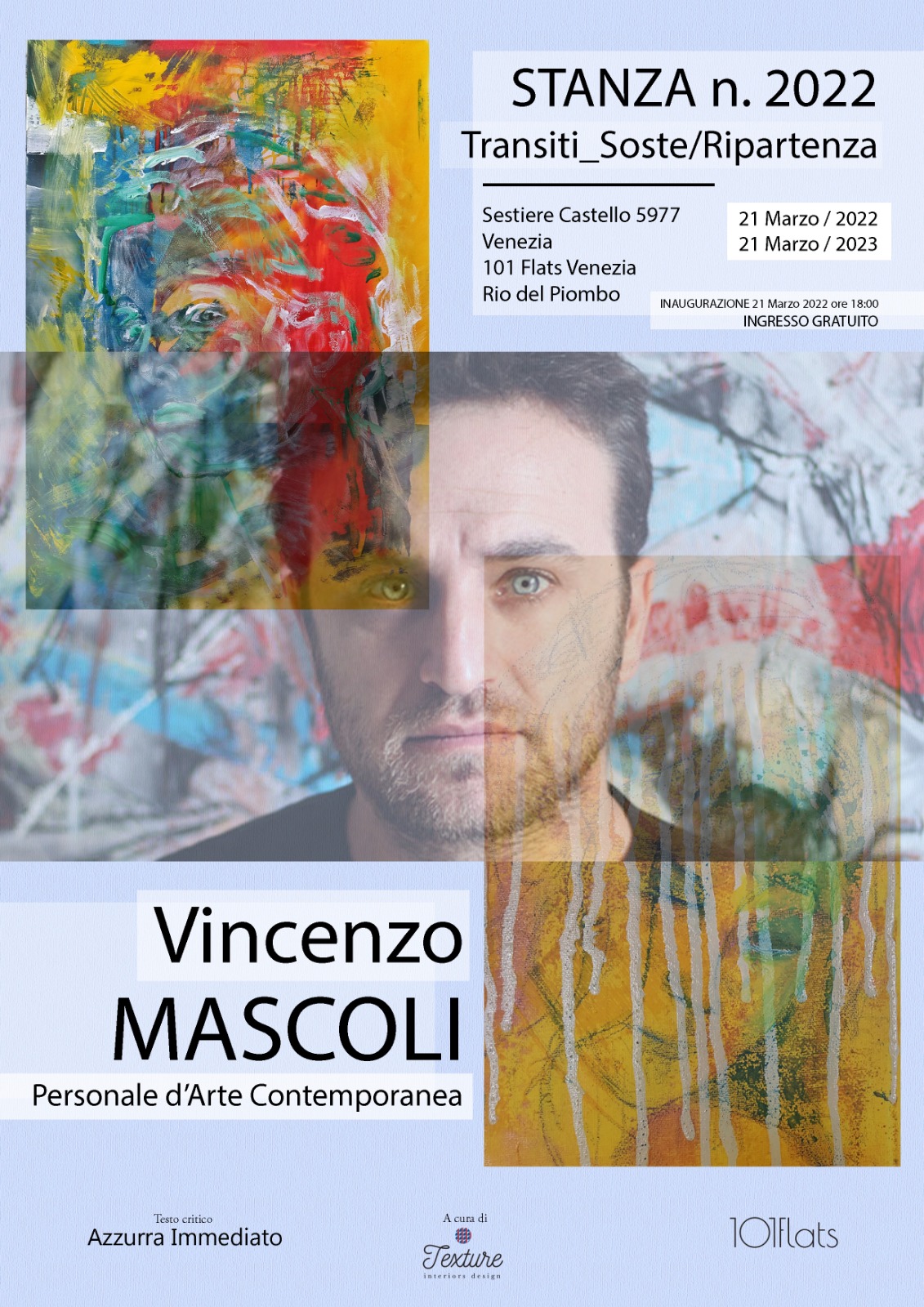Milano, Firenze, Venezia. Città, strade, suites. Intersezioni di spazi e tempi che ritrovano, attraverso le opere dell’artista e scenografo Vincenzo Mascoli e del progetto itinerante Stanza n.2020-1-2 Transiti_Soste/Ripartenze, un fil rouge che sta definendo, nel connubio creatosi con Texture srl & Prospero Consulting, una trama che segue le dinamiche generative del progetto 101Flats., ove arte ed accoglienza si fondono al fine di creare una vera esperienza immersiva. Seguendo la scia del Missori Suits di Milano e della Residenza di Borgo Albizi a Firenze, il viaggio dell’arte di Mascoli, accompagnato ancora una volta da un testo critico di Azzurra Immediato, giunge ora a Venezia, che quest’anno ospita la 59° Esposizione Internazionale d’Arte Biennale. Alla crescita del progetto 101Flats, che racchiude in ogni sua struttura ricettiva ricerca di una identità sempre unica e confortevole, fa da contraltare il percorso messo in atto dall’artista Vincenzo Mascoli le cui opere dialogano con le suites, e non solo, ridefinendo il concetto di relazione tra opera d’arte e luogo ospite: non più decorazione ma emozione.