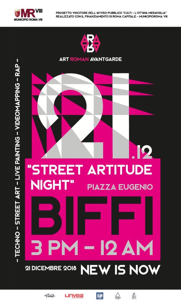 L’evento Street ARTitude Night si terrà presso Piazza Eugenio Biffi il giorno Venerdì 21 Dicembre, a partire dalle ore 16:30. L’evento si propone di mettere insieme in un’unica data nella suggestiva piazza alle porte di Garbatella un gruppo eterogeneo di artisti e musicisti per dar vita ad una manifestazione culturale unica nel suo genere.