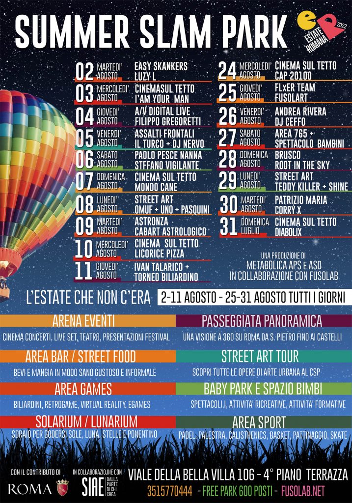 Estate Romana 2022: parte il Summer Slam Park con diciassette giorni di musica, cinema, teatro, a/v digital performance e street art a ingresso interamente gratuito. La manifestazione è ospitata a 17mt d’altezza nello spazio del Casilino Sky Park, realizzato riqualificando l’ultimo piano di un parcheggio in disuso e inaugurato lo scorso maggio dal sindaco Gualtieri.