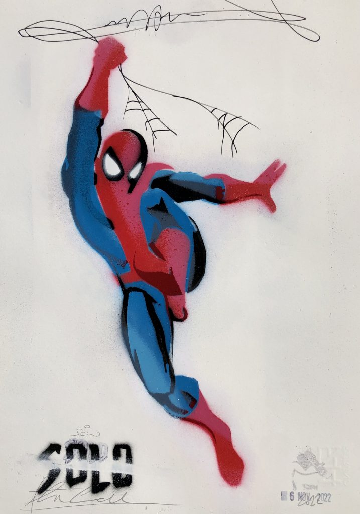 Flavio Solo, artista significativo della street art a livello internazionale, è noto per le sue raffigurazioni di supereroi in crisi, propone a SUPERARTE un’opera realizzata con il suo stencil storico dell’Uomo Ragno, e una bellissima serigrafia.
