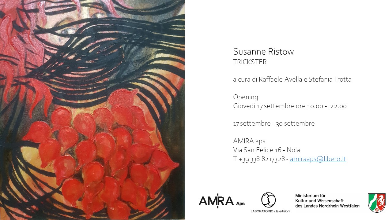 Nella sua presentazione allo Spazio dell'associazione Amira di Nola Susanne Ristow esporrà una nuova serie di dipinti ad olio della serie "Trickster". I dipinti sono eseguiti nei "colori tedeschi" nero-rosso-oro, ma ovviamente giocano con l'ambivalenza dell'attribuzione dell'identità. Lo spettatore incontra in un selvaggio mix di riferimenti pop-culturali le tracce di un'intensa disamina dell'area culturale napoletana. Ristow ha visitato Napoli per la prima volta negli anni Novanta durante i suoi studi artistici con Jannis Kounellis all'Accademia d'Arte di Düsseldorf. DAl 1999 collabora con “Il Laboratorio di Nola/ le edizioni”di Vittorio Avella, Tonino Sgambati.