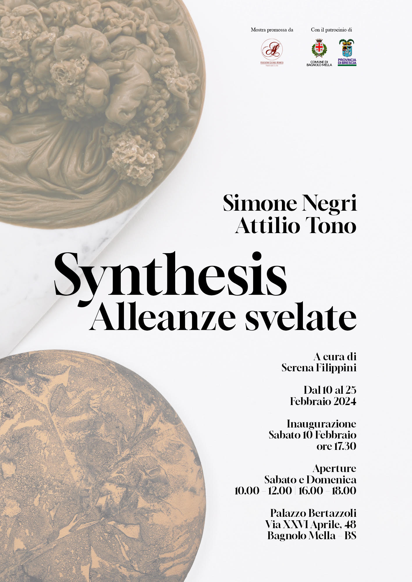 Negli spazi del Palazzo Bertazzoli prende vita un intenso scambio tra le opere di due artisti, rappresentati da linguaggi espressivi differenti, che trova un punto d’incontro nella sintesi di forme, consistenze, colori e percezioni. Questa sintesi, alla quale si ispira il titolo della mostra, si rivela vitale e pregna di una costante ed instancabile collaborazione tra l’artista e i materiali ai quali affida la realizzazione: la ceramica nel caso di Simone Negri, il gesso, il marmo e il legno per Attilio Tono.