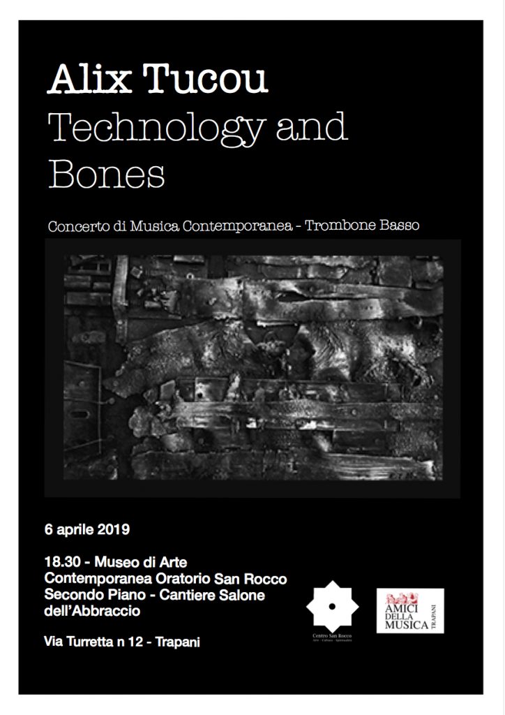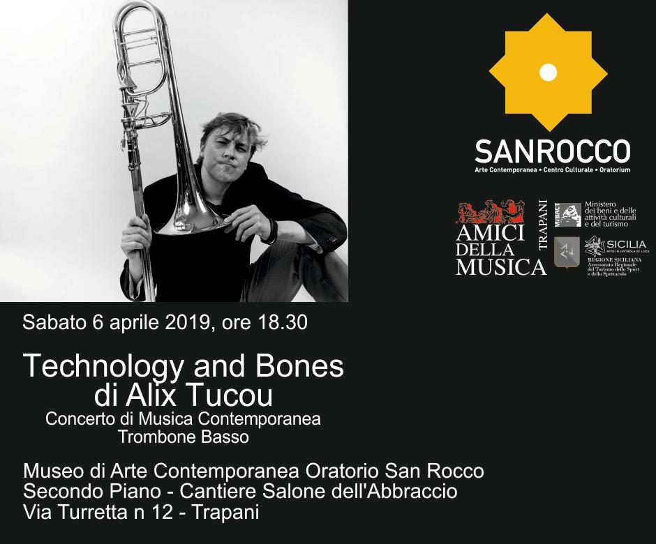 Il 6 aprile, alle ore 18:30, presso il Museo di Arte Contemporanea Oratorio San Rocco Alix Tucou, Bass Trombonist e compositore francese di fama internazionale, proporrà il suo album da solista “Technology and Bones”. Il progetto è già stato presentato, per la prima volta, in occasione del Further Complications Festival presso lo spazio sperimentale SPECTRUM sito in Brooklyn (NYC): uno spazio che ha ospitato numerosi e rinomati nomi provenienti dall’Europa, Nord America e Sud America. Recentemente l’artista si è esibito in Sicilia presso il Convento del Carmine di Marsala e presso la Galleria d’Arte Contemporanea Giuseppe Veniero Project di Palermo, durante il Live Painting dell’artista catanese Maurizio Pometti.