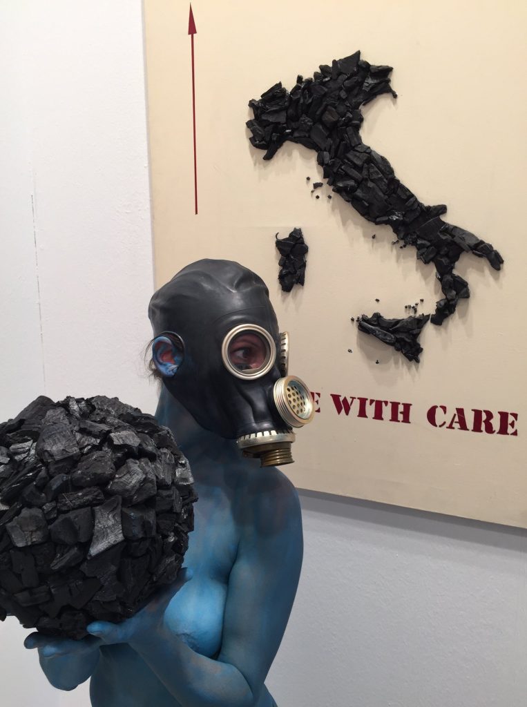Una donna dipinta di blu che tiene in mano cullandolo un globo terrestre le cui terre emerse sono realizzate con il carbone, a sottendere l’inquinamento ecologico e sociale caratterizzante la nostra epoca. L’intimità caratterizza questa performance che si offre come dono morale e di speranza.