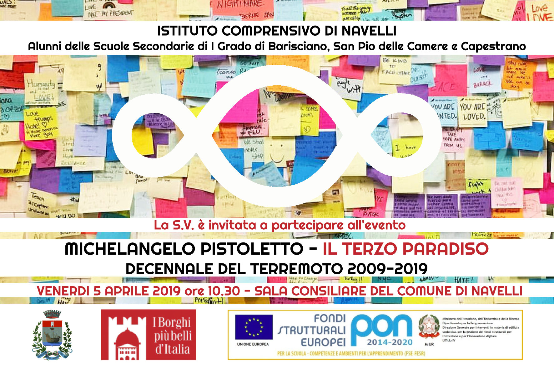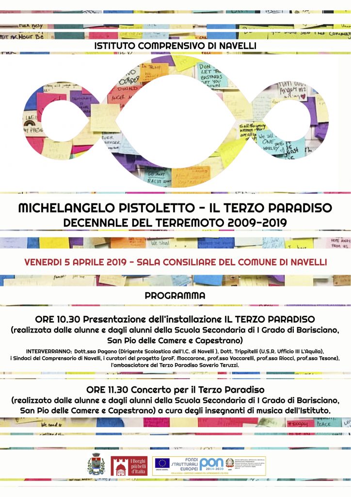 I ragazzi e le ragazze della scuola Secondaria di I Grado dell’Istituto Comprensivo di Navelli, in collaborazione con la Città dell’arte-Fondazione Pistoletto realizzeranno il 5 aprile 2019 presso la sede del Comune di Navelli una installazione del simbolo coniato dall’artista Michelangelo Pistoletto denominato Terzo Paradiso. Il simbolo è stato diffuso dall’artista in tutto il mondo, cambiando veste e funzione in base al luogo di realizzazione, dal Consiglio dell’Unione Europea a Bruxelles al Palazzo delle Nazioni di Ginevra sede dell’ONU, fino a raggiungere lo spazio nel 2018 grazie alla missione Expedition 53/53 con la quale è entrato nella Stazione Spaziale Internazionale.