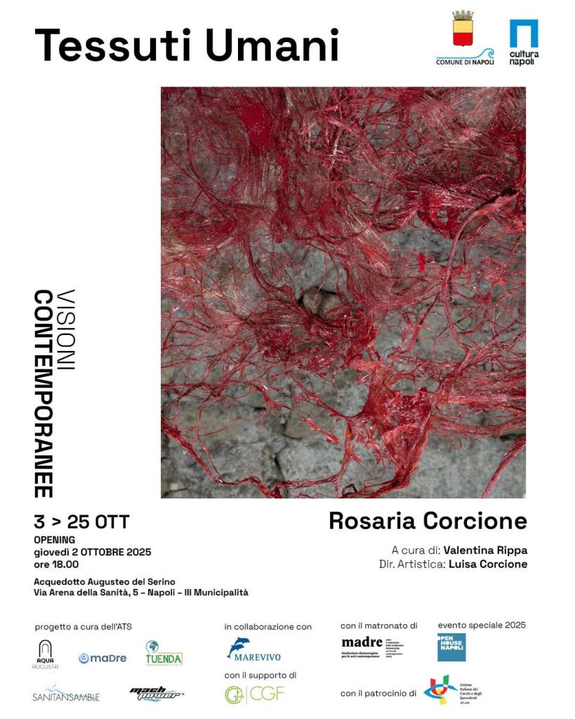 la mostra TESSUTI UMANI di Rosaria Corcione a cura di Valentina Rippa con la direzione artistica e organizzativa di Luisa Corcione ha luogo negli spazi dell’Acquedotto Augusteo del Serino. L’iniziativa è promossa e finanziata dal Comune di Napoli nell’ambito del progetto “Visioni contemporanee” parte della programmazione di arte contemporanea 2025. intende sensibilizzare il pubblico sulla crisi ecologica e il problema dell'inquinamento da microplastiche e allo stesso modo rendere evidente la capacità del processo artistico di restituire bellezza.