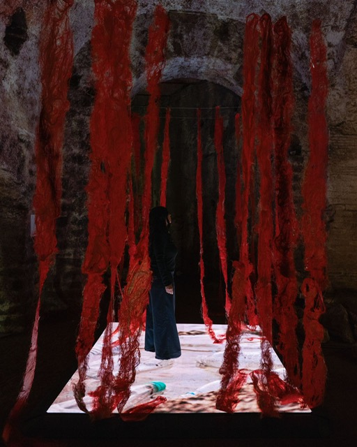 Partendo da questo presupposto, l’artista Rosaria Corcione, realizza un progetto espositivo che fin da subito si presenta come un viaggio nel cuore della materia e della memoria. All’interno del suggestivo spazio dell’Acquedotto Augusteo, sito archeologico romano, ventre antico che un tempo accoglieva l’acqua, linfa vitale della città, l’artista da vita ad un’istallazione che evoca nella sua realizzazione lo strato epidermico, la pelle, tessuta con gesti che sembrano rimandare al respiro della materia viva.