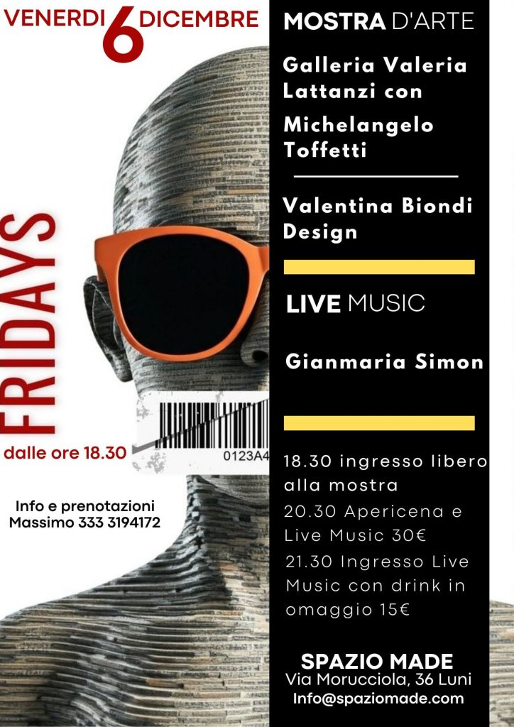 Appuntamento venerdì 06/12, allo Spazio Made di Luni, con “The Fridays”, il format- nato per iniziativa dell’Associazione Culturale Aesthetica- che unisce, in una ricercata atmosfera industrial-chic, gusto, arte e musica dal vivo.