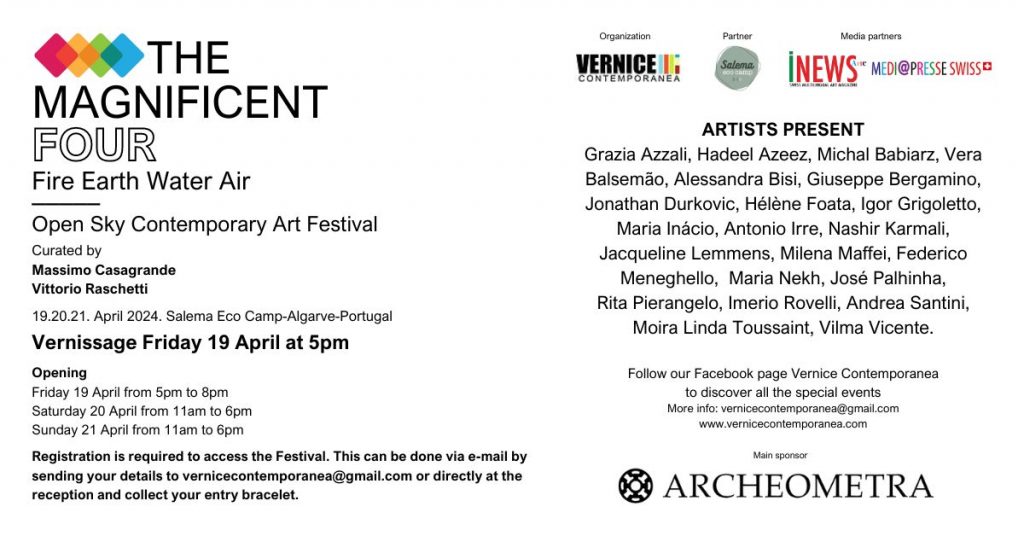 L'Associazione Culturale Internazionale Vernice Contemporanea, in collaborazione con i partner Salema Eco Camp, Archeometra, Mediapresseswiss e Inews, presenta la prima edizione di "The Magnificent Four", un festival internazionale di arte contemporanea all'aperto che si svolge nel Parco Naturale di Salema-Portogallo. Il tema del progetto è quello dei quattro elementi naturali: Fuoco, Terra, Acqua e Aria, elementi che caratterizzano la costa meridionale portoghese.