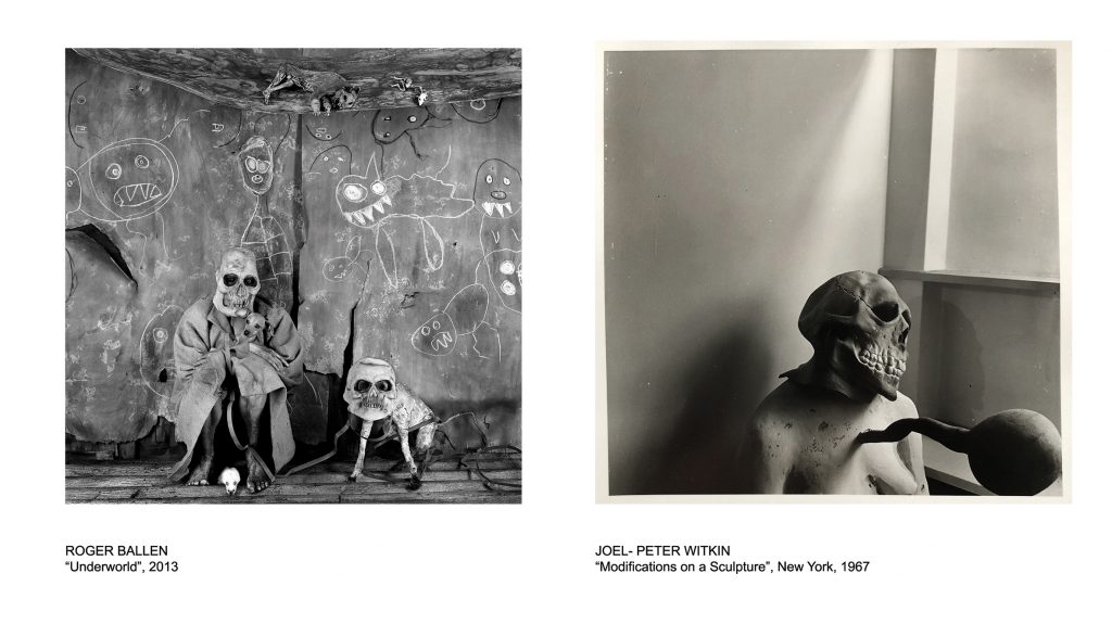 E dall’ottica di una lente “inquietante” osserviamo le fotografie in bianco e nero realizzate da Roger Ballen e Joel-Peter Witkin che abbracciano decenni della loro carriera, con un effetto perturbativo che riverbera dai soggetti macabri alle analogie delle immagini non convenzionali create dai due autori: le composizioni di Witkin spesso orientate al macabro, includono cadaveri e frammenti anatomici, ma egli anticipa lo scatto con un’accurata progettazione, attraverso schizzi preliminari e successivamente si serve di esposizioni multiple, montaggi e fotoincisioni per permeare le scene con una qualità onirica, mistica e occulta. Al contrario, il vocabolario visivo di Ballen incorpora l'uso di oggetti fatiscenti o scartati, oggetti trovati e tassidermia, manichini umani e parti del corpo reali, elementi grafici come fili e disegni art-brut, giocattoli e animali domestici (uccelli, gatti, ratti) nella costruzione fisica di un set teatrale.