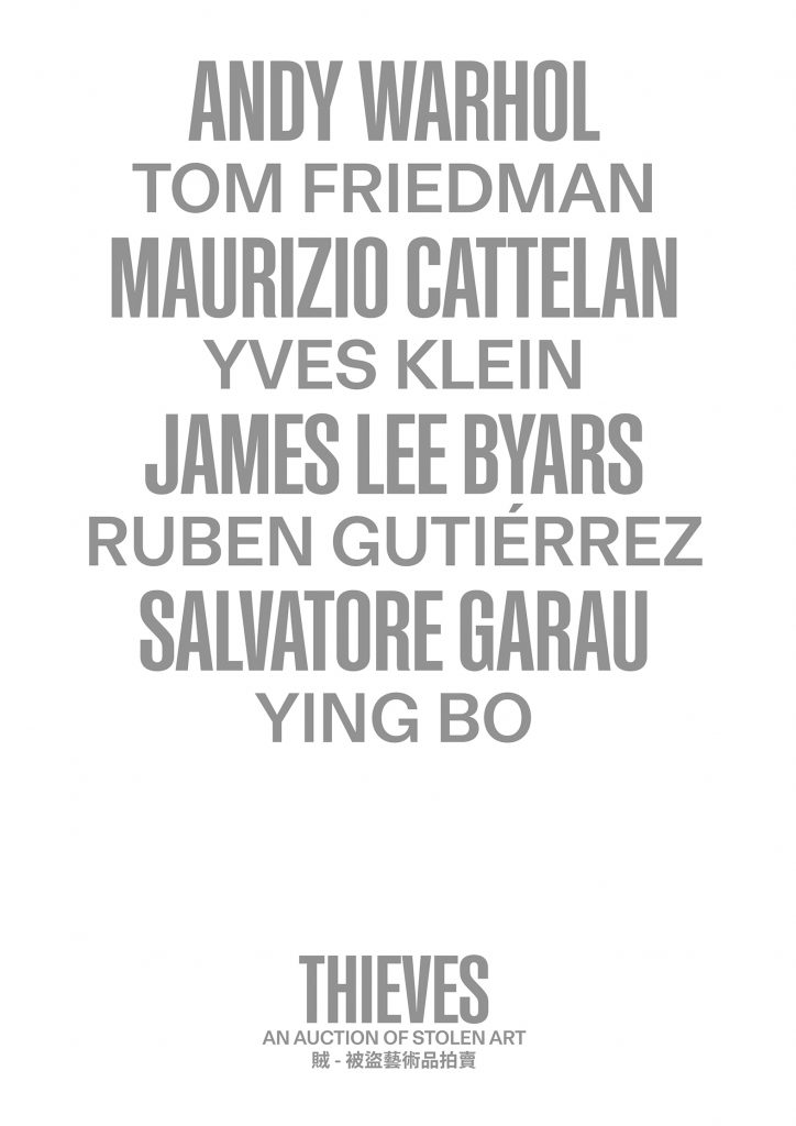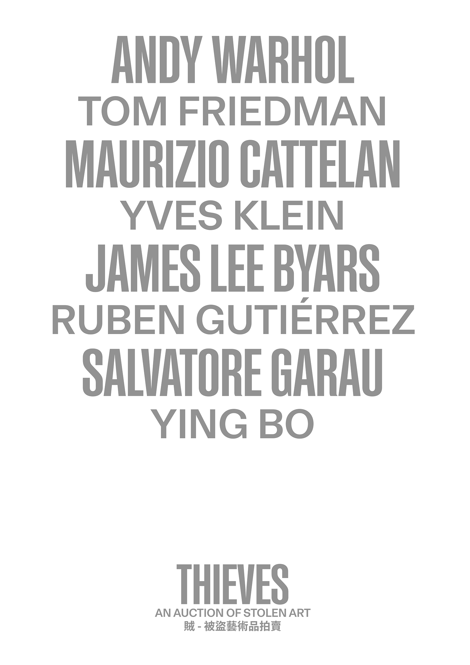 "THIEVES. STOLEN ART ON AUCTION" è una campagna integrata che promuove la performance artistica 'Thy Gala' che si svolgerà durante la settimana di Art Basel HK. Il progetto mira ad aumentare la consapevolezza sugli spazi artistici indipendenti a Hong Kong, essenziali per l'ecosistema locale, e a raccogliere fondi per lo spazio artistico Thy Lab, celebrandone la sopravvivenza decennale e contribuendo alla missione di sovvertire le pratiche artistiche a Hong Kong.