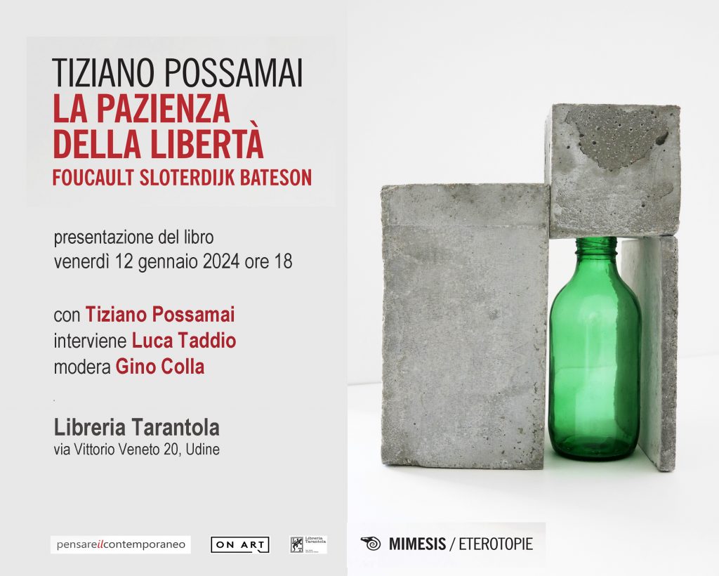 "La pazienza della libertà. Foucault Sloterdijk Bateson" di Tiziano Possamai, Mimesis Edizioni. Presentazione e discussione del libro a cura dell'associazione culturale On Art, venerdì 12 gennaio 2024 alle ore 18.00, presso la libreria Tarantola, via Vittorio Veneto 20 a Udine.