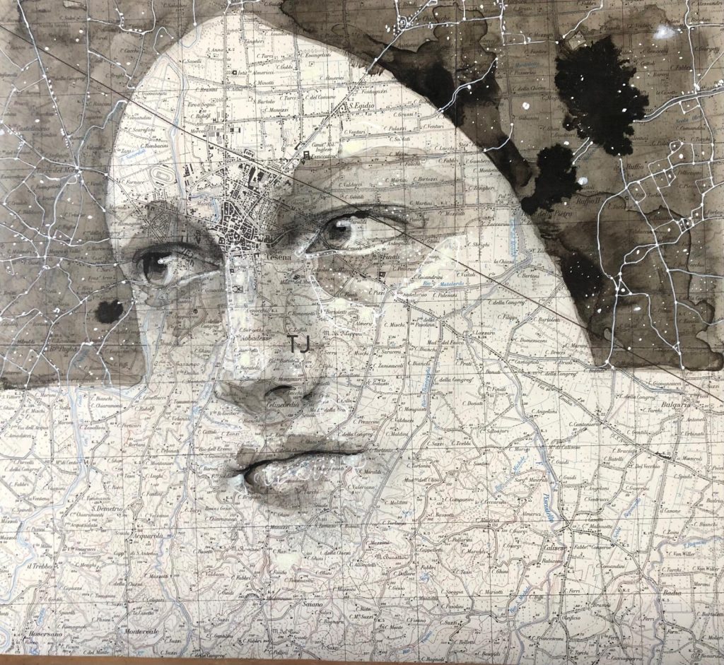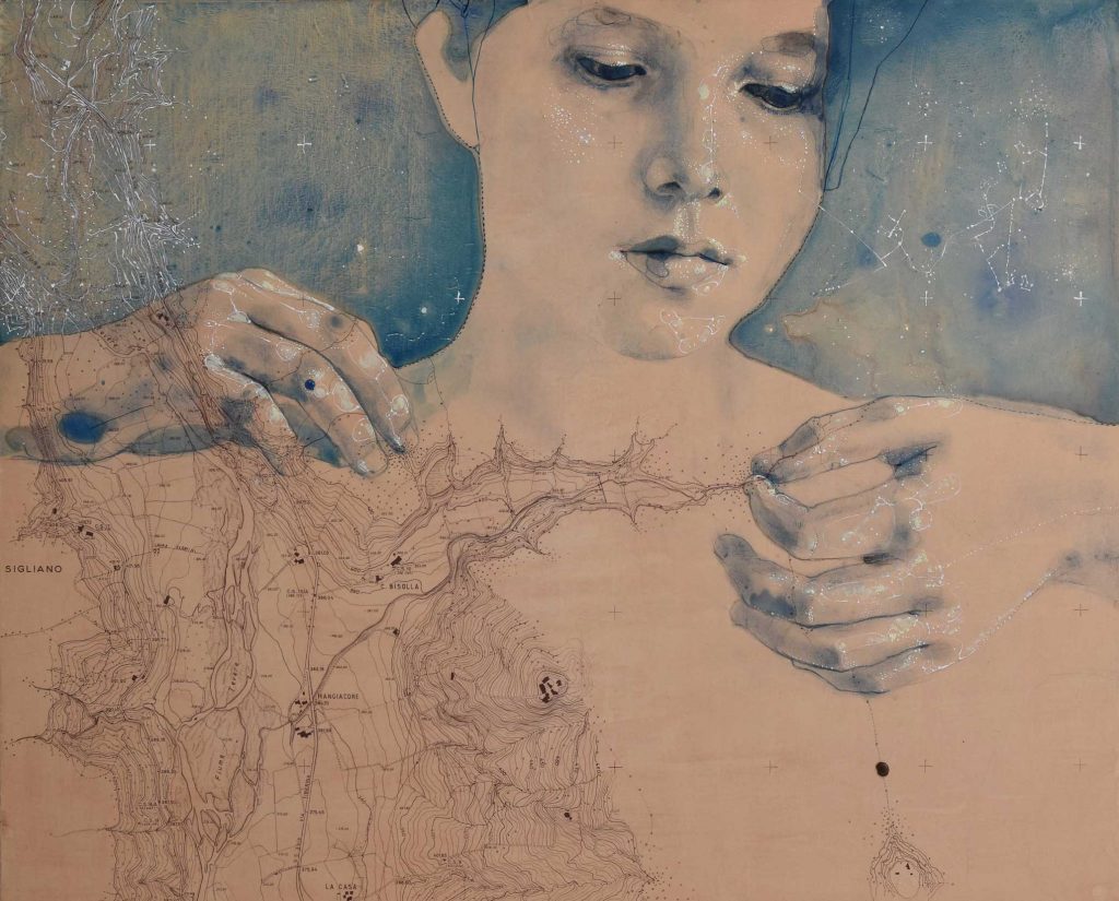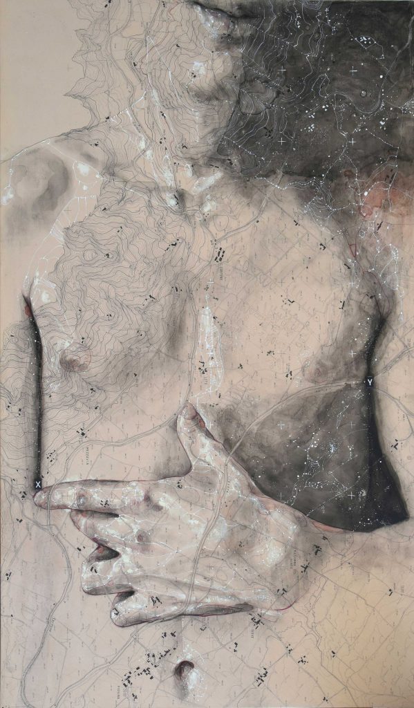 In questo progetto, la pratica artistica di Serafini si concentra sul corpo e sulla sua capacità di attraversare il tempo, la materia, la memoria. I suoi lavori nascono da un gesto paziente e silenzioso che si deposita su vecchie mappe, carte tecniche, cartografie ormai dismesse: supporti nati per misurare lo spazio ma che qui diventano terreno per un’indagine intima, antropologica, mai illustrativa.