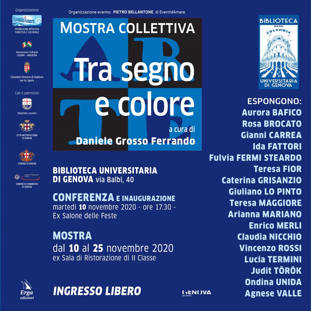 Questa nuova rassegna artistica “Tra Segno e Colore” organizzata con acume critico da PIETRO BELLANTONE, un collettiva a cui partecipano 17 artisti. I lavori esposti indicano che il ritorno alla pittura e alla “manualità” dell’arte, iniziate con la Transavanguardia e con il Neo-espressionismo, dopo le sperimentazioni concettuali degli anni ’60 e ’70, sia diventato una componente irrinunciabile del panorama artistico contemporaneo. Espongono: ESPONGONO: Aurora BAFICO, Rosa BROCATO, Gianni CARREA, Ida FATTORI, Fulvia FERMI STEARDO , Teresa FIOR, Caterina GRISANZIO, Giuliano LO PINTO, Teresa MAGGIORE, Arianna MARIANO, Enrico MERLI, Claudia NICCHIO, Vincenzo ROSSI, Lucia TERMINI, Judit TÖRÖK, Ondina UNIDA, Agnese VALLE