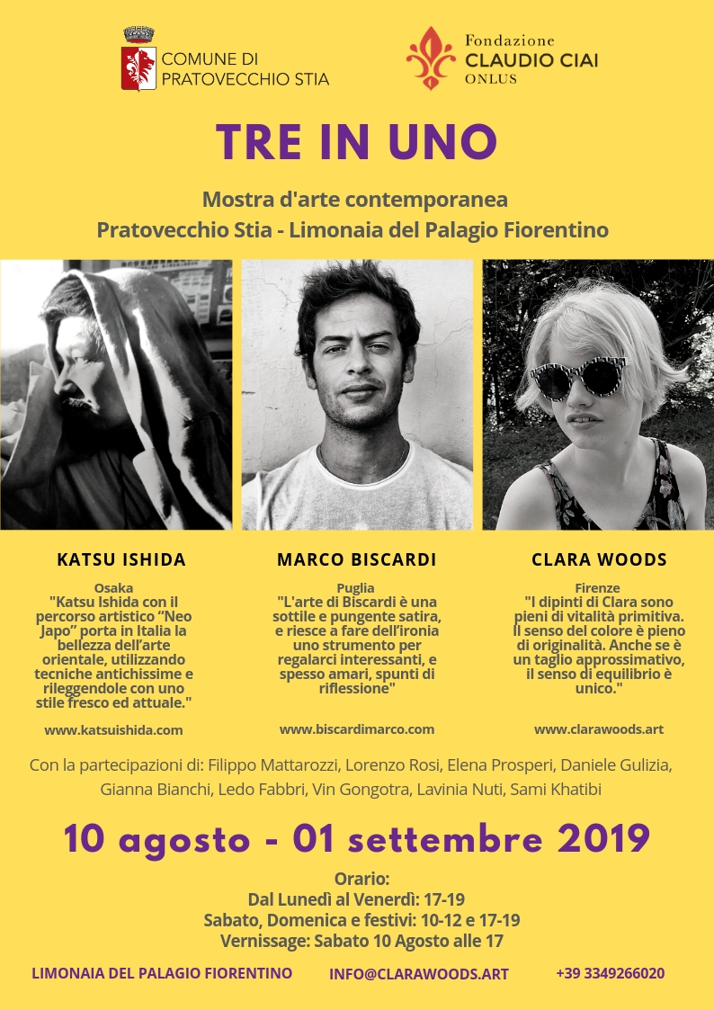 La mostra, dal titolo “Tre in uno” rappresenta l’incontro di tre generazioni, tre percorsi professionali e tre tecniche pittoriche diverse che si armonizzano in uno spazio comune. Katsu Ishida, designer, pittore e anche fotografo, ha iniziato a dipingere soltanto nel 2010 e in un anno ha ottenuto dieci premi in importanti concorsi. Le sue opere sono spesso descritte come "Neo-Japonism", una corrente unica nella nostra storia artistica, profondamente radicata nella cultura giapponese. Marco Biscardi, pittore pugliese trapiantato prima Roma, poi a New York e infine a Firenze, ha all'attivo oltre quaranta mostre tra Italia, Cina, Spagna, Stati Uniti e Caraibi. Nella sua arte convergono elementi di critica alla degenerazione contemporanea, cogliendone i sintomi nelle grandi catastrofi del passato e nelle contraddizioni odierne. E insieme a loro Clara, con tutti i suoi colori, il suo vissuto e il suo ottimismo coinvolgente.
