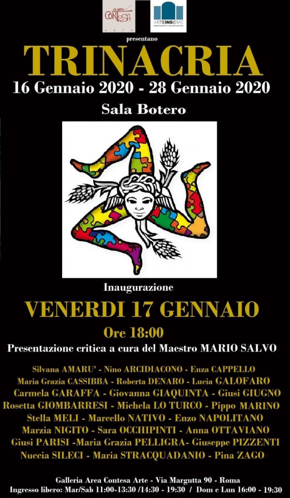 Mostra di 24 artisti siciliani nella galleria Area Contesa Artis, a Roma. In via Margutta, la collettiva organizzata da Arteinsieme. Premiata l'artista Marzia Nigito, di Niscemi. Espongono: Silvana Amarù, Nino Arcidiacono, Enza Cappello, Maria Grazia Cassibba, Roberta Denaro, Lucia Galofaro, Carmela Garaffa, Giovanna Giaquinta, Giusi Gugno, Rosetta Giombarresi, Michela Lo Turco, Pippo Marino, Stella Meli, Marcello Nativo, Enzo Napolitano, Marzia Nigito, Sara Occhipinti, Anna Ottaviano, Giusi Parisi, Maria Grazia Pelligra, Giuseppe Pizzenti, Nuccia Sileci, Maria Stracquadanio, Pina Zago.