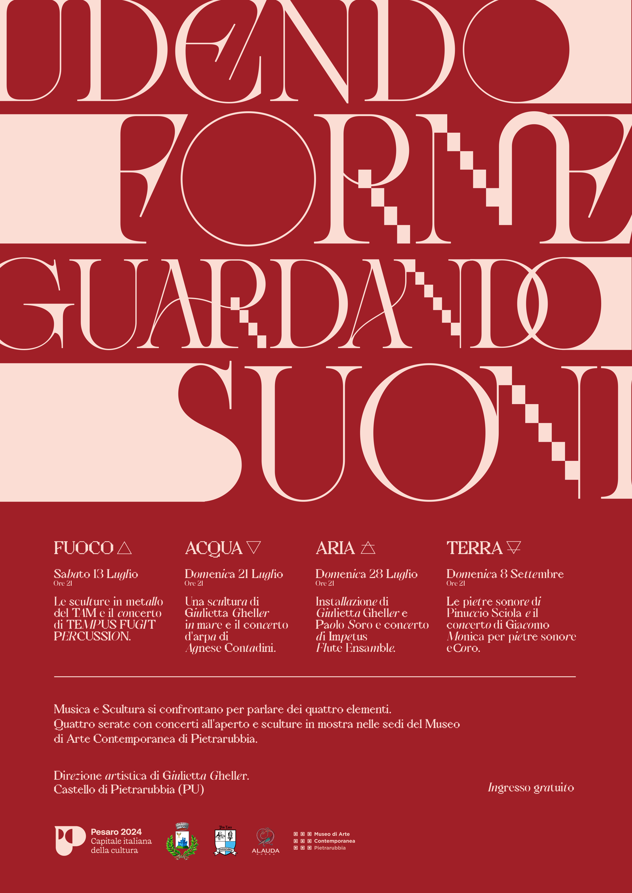 Il tema dei quattro elementi, Terra, Fuoco, Acqua e Aria, condurrà un ciclo di quattro eventi in cui, nel borgo di Pietrarubbia, sede dell’ex-TAM, ora Museo di Arte Contemporanea, verranno legate esposizioni di scultura contemporanea, performance e concerti di musica classica all’aperto.
