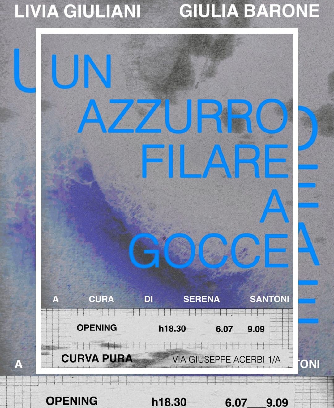 Curva Pura è lieta di presentare Un azzurro filare a gocce a cura di Serena Santoni, dove le opere di Giulia Barone e di Livia Giuliani riflettono sulla generazione dell’acqua e delle sue capacità e criticità.