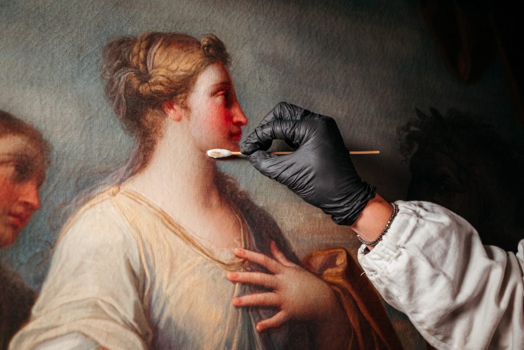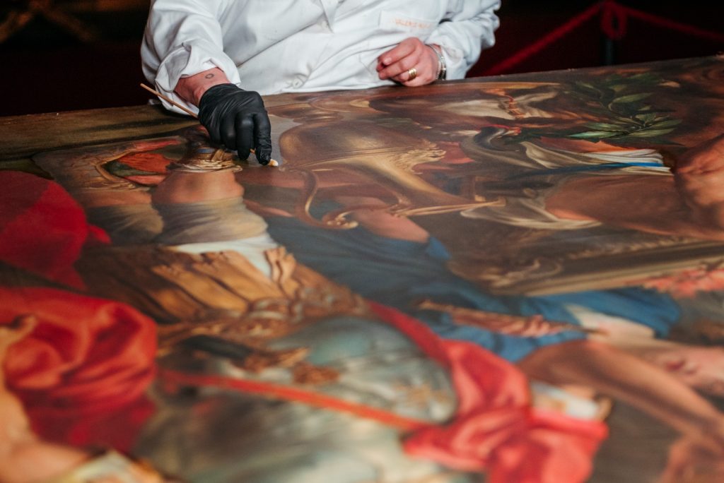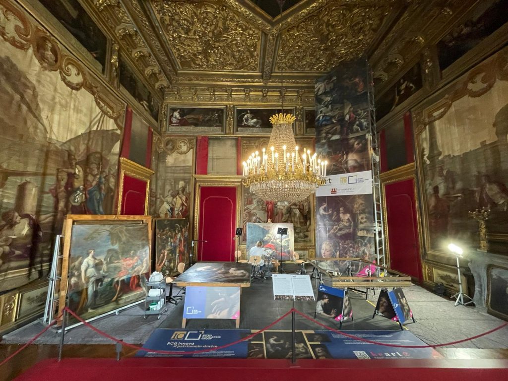 Lo scorso marzo un intervento di manutenzione ha interessato le sei sovrapporte della Sala degli Staffieri nell’Appartamento di Rappresentanza di Palazzo Reale, a continuazione del restauro del fregio seicentesco con Allegorie delle Virtù regie allestito nella medesima sala (ottobre 2022-marzo 2023). I lavori, sostenuti da Retrç Consulting Group e condotti dalla ditta Mnemosyne Servizi con un cantiere a vista che ha coinvolto il pubblico tramite immagini ingrandite proiettate su monitor, visite guidate e post sui canali social dei Musei Reali, termineranno il 26 giugno.