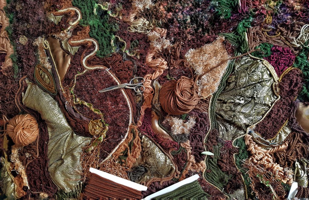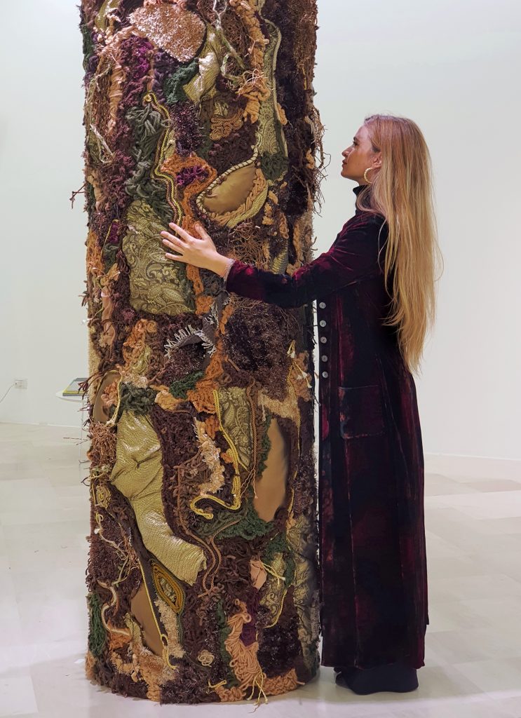 Quando sono tornata in Puglia dall' Inghilterra, un paio d'anni fa', sono rimasta sconvolta dal cimitero di ulivi creato dalla Xylella. Ho pianto e ho riflettuto. Ho iniziato a studiare in generale il tema della deforestazione, per questo ho scelto di creare un tronco di tessuto in materiali così preziosi, proprio come lo è un albero per noi, per la terra, unico nella sua forma e nella sua crescita, un opera d'arte creata dalla natura...