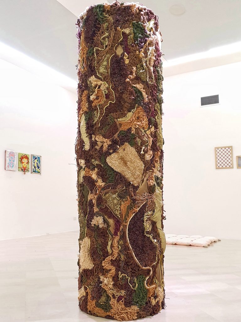 Interamente lavorato a mano, con sete, cordoni, damascato, cachemire, un gioco tattile tra imbottiture e fibre in legno. L' installazione statuaria e imponente, ricorda a tratti gli antichi salotti dove si conversava a lungo, luoghi di ricordi dell'infanzia dell'artista. Sei mesi di lavoro ininterrotto hanno dato vita ad un tronco sacro e prezioso.