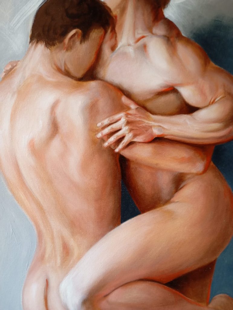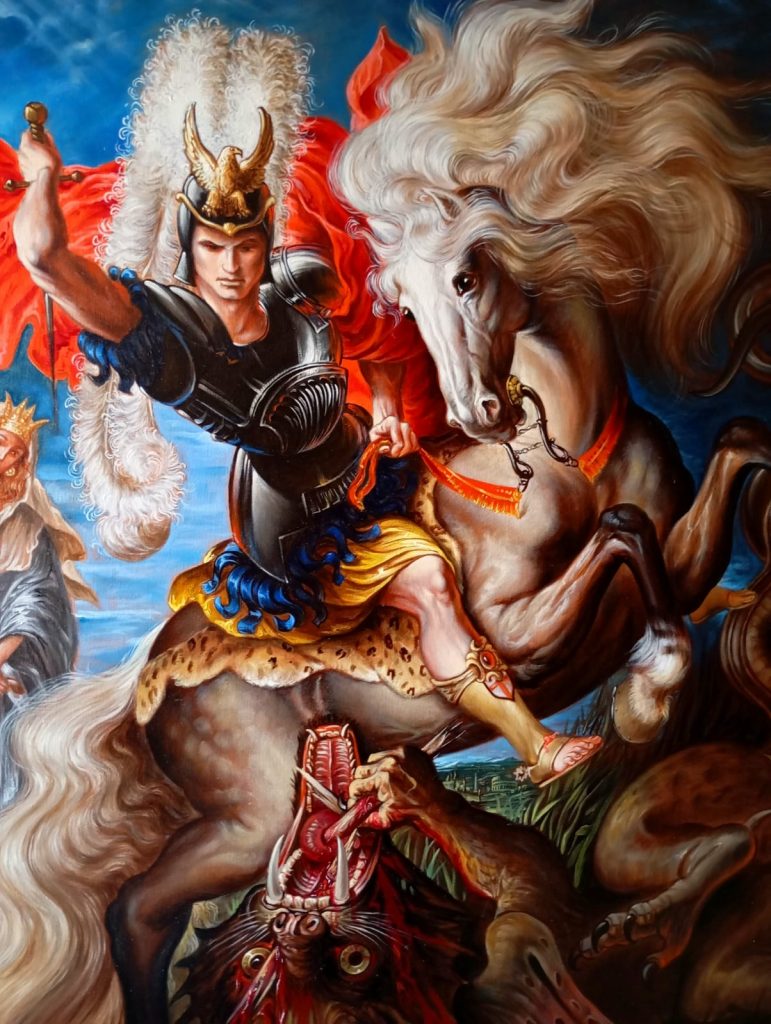 Dall’altra l’arte di Ilian Rachov, anch’esso bulgaro ma ormai da molti anni residente a Roma, estremamente figurativo, che si ispira ai grandi maestri rinascimentali e barocchi del passato, creando in chiave contemporanei affreschi, ritratti e tele religiosi e mitologiche. .